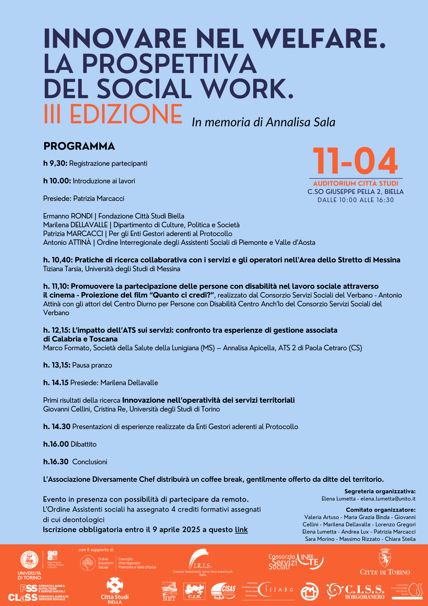 promosso dagli Enti Gestori aderenti al “Protocollo Innovazione Sociale in ricordo di A. Sala” e dai corsi di laurea in Servizio Sociale e Politiche e Servizi Sociali dell’Università di Torino.