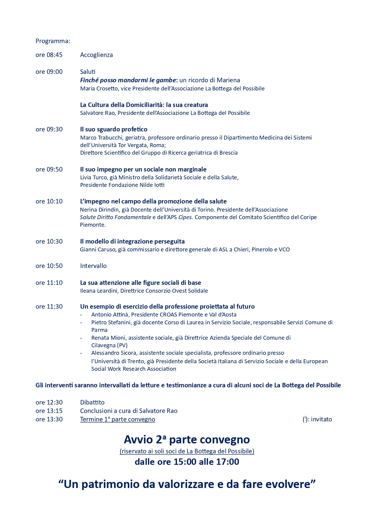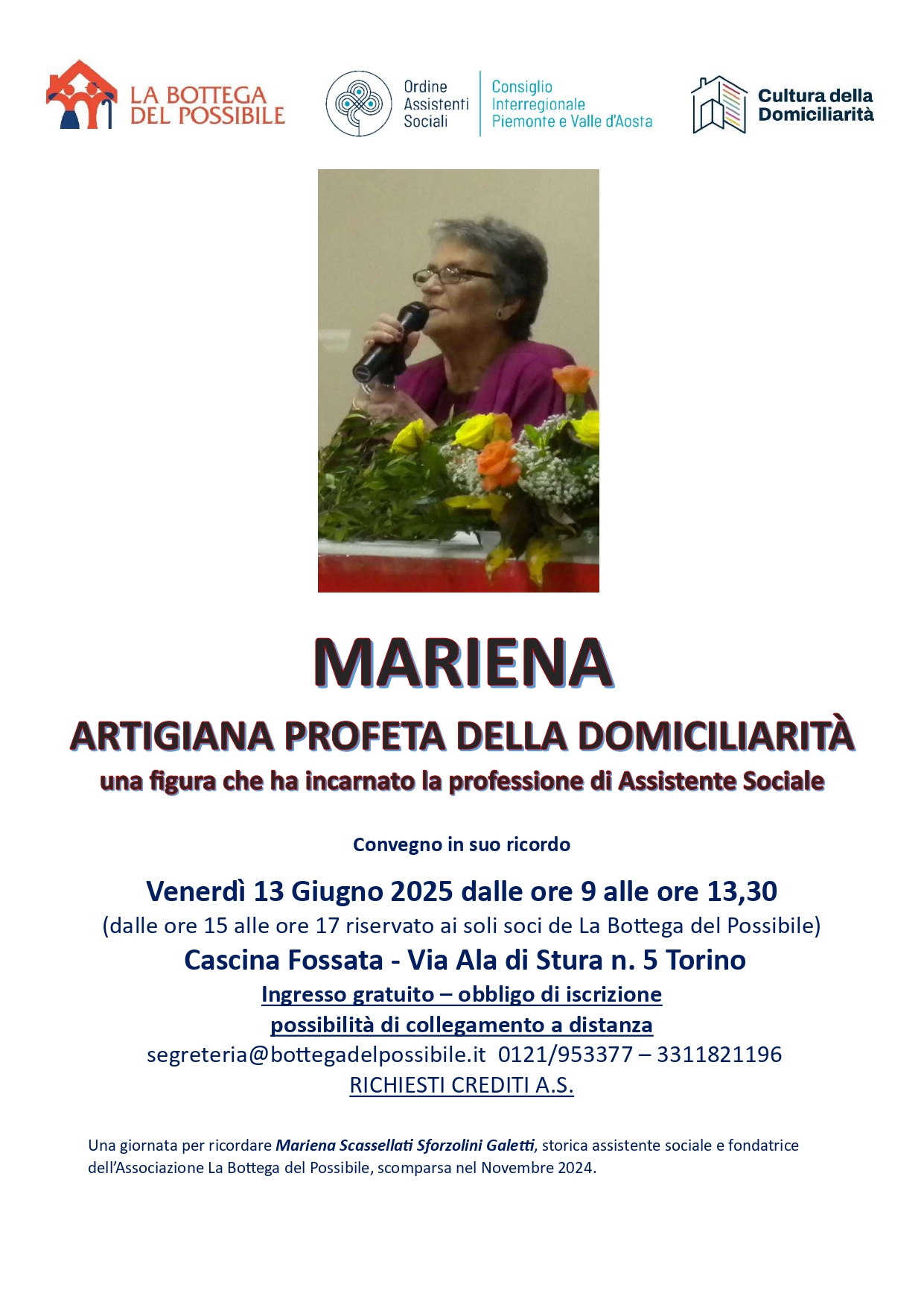 con la presente Vi segnaliamo che venerdì 13 Giugno 2025 dalle ore 9 alle ore 13,30 (dalle ore 15 alle ore 17 riservato ai soli soci de La Bottega del Possibile) presso Cascina Fossata – Via Ala di Stura n. 5 a Torino si terrà un convegno in ricordo di Mariena Scassellati Sforzolini Galetti, storica assistente sociale e fondatrice dell’Associazione La Bottega del Possibile, scomparsa nel Novembre 2024.