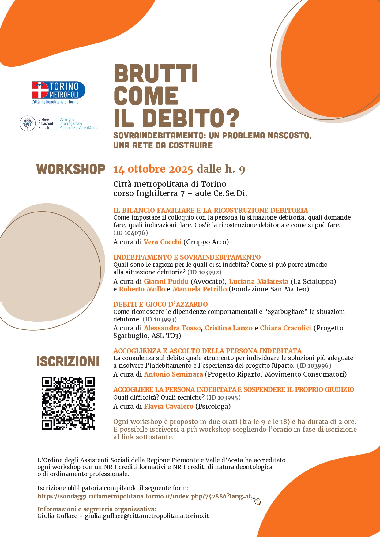 14 ottobre 2025 Workshop “BRUTTI COME IL DEBITO” – Crediti formativi e deontologici riconosciuti- 27 Agosto 2025 Gentili Colleghi e colleghe, in allegato locandina del Workshop in oggetto che si terrà il 14 ottobre 2025 dalle h 9.00 segreteria 27 Agosto 2025 Articolo Precedente In ricordo di Loredana Trinchieri Articolo Successivo Corso di perfezionamento Post Lauream – “Servizio sociale d’urgenza e soccorso”