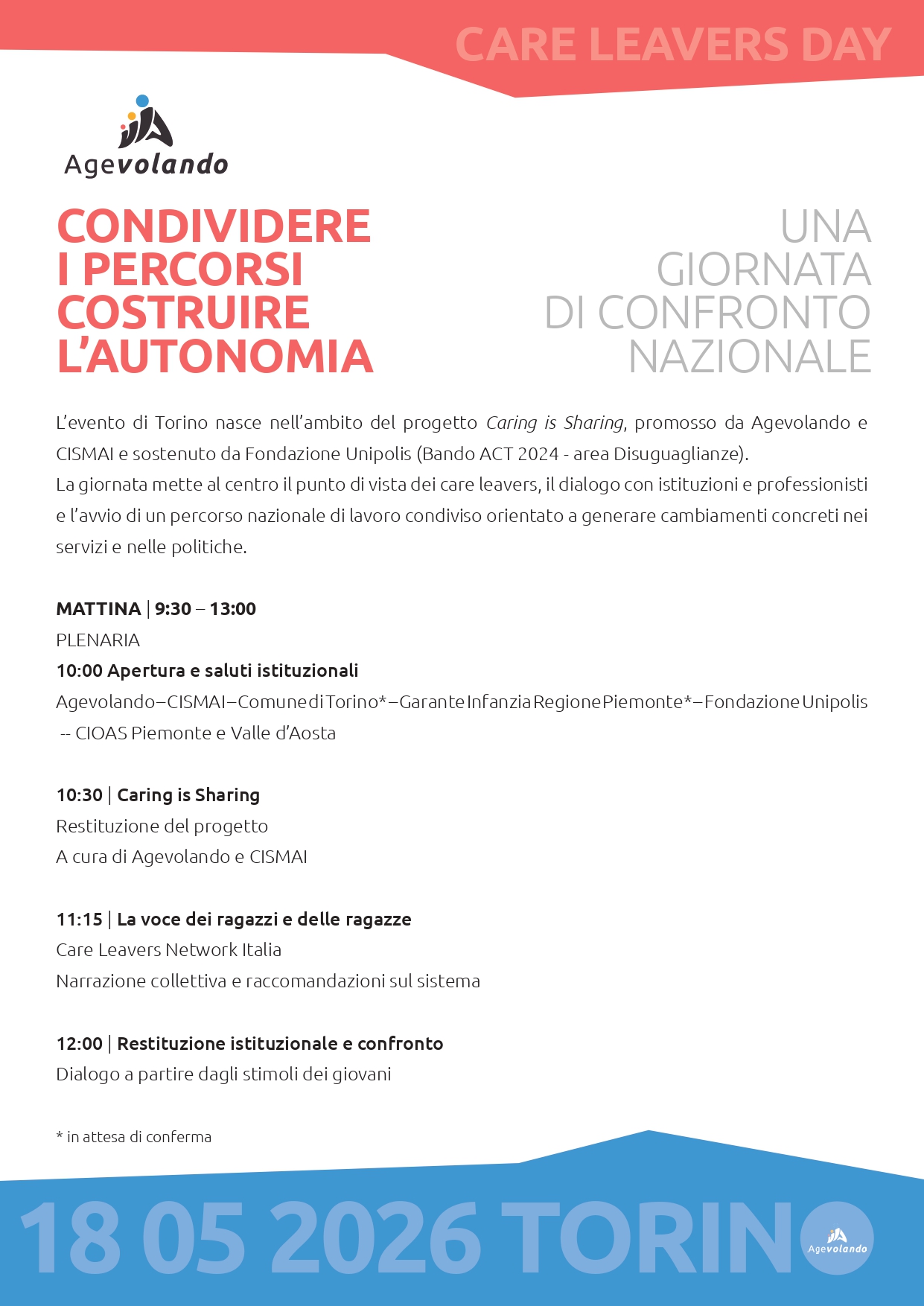Il Convegno nazionale per promuovere e tutelare i Care Leavers in Italia quest’anno si terrà a Torino il 18 maggio, nella giornata del Care Leavers Day.