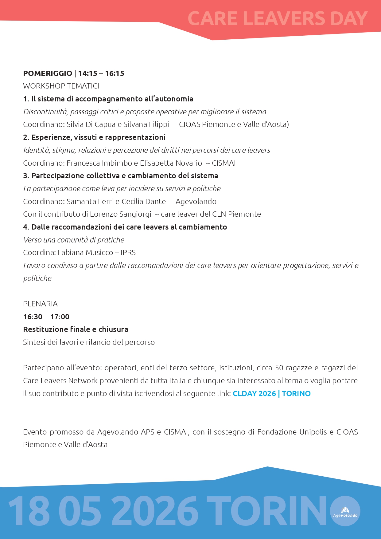 Iscrizione al seguente link: https://www.eventbrite.it/e/care-leavers-day-tickets-1988320279480?aff=ebdsoporgprofile&_gl=1*sc954p*_up*MQ..*_ga*MTcyNTk1ODQ0Ny4xNzc3NDA5Mjkx*_ga_TQVES5V6SH*czE3Nzc0MDkyODkkbzEkZzAkdDE3Nzc0MDkyODkkajYwJGwwJGgw