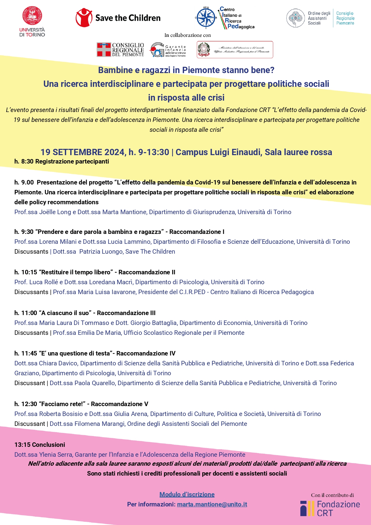 Il 19 settembre 2024 dalle ore 9.00 alle ore 13:30 presso il Campus Luigi Einaudi di Torino (Sala lauree rossa) verranno presentati i risultati di una interessante ricerca condotta da diversi Dipartimenti dell’Università di Torino in collaborazione con Enti e Istituzioni del territorio e in partenariato con il Consiglio Ordine Assistenti Sociali del Piemonte. Una ricerca interdisciplinare che ha visto la partecipazione di alcuni Servizi Sociali e Centri per le famiglie del territorio e la partecipazione attiva di ragazzi e ragazze intervistati/e. I/le ragazzi/e hanno portato interessanti suggerimenti e spunti di riflessione per il mondo degli adulti e per le Istituzioni che hanno la responsabilità della progettazione e gestione delle politiche educative -sociali -sanitarie.