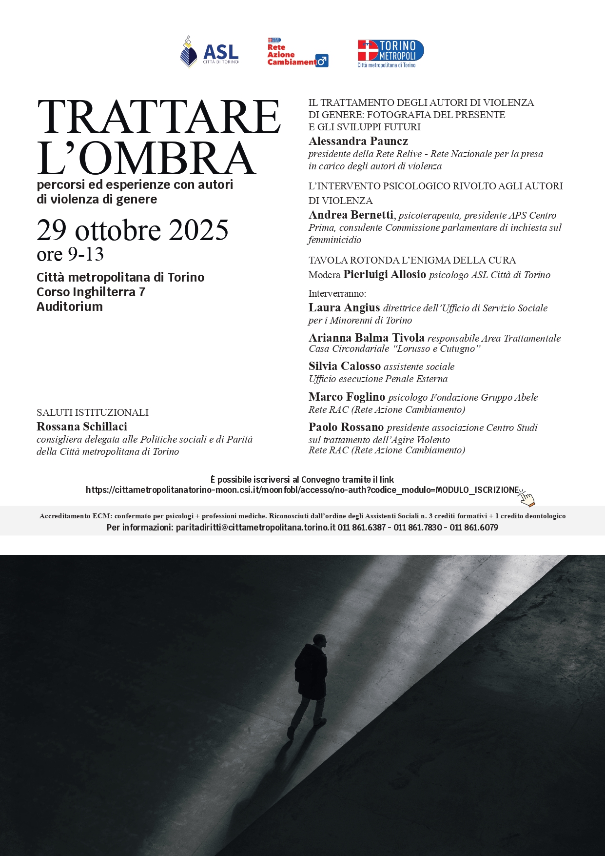 29 ottobre 2025 ore 9-13 – Auditorium Città metropolitana di Torino Corso Inghilterrà 7 – “TRATTARE L’OMBRA: percorsi ed esperienze con autori di violenza” 12 Ottobre 2025 RICEVUTO E PUBBLICATO Iscrizioni aperte cliccando qui. segreteria 12 Ottobre 2025 Articolo Precedente Premio per “I 25 anni della Legge 328: il futuro del welfare dei diritti.” Scad. 20 ottobre 2025 Articolo Successivo Elezioni mandato 2026-2030 – Indizione delle elezioni online per il rinnovo del CIOAS Piemonte e Valle d’Aosta e del Revisore unico dei conti. Trasmissione candidature entro le ore 13 del 17/10/2025