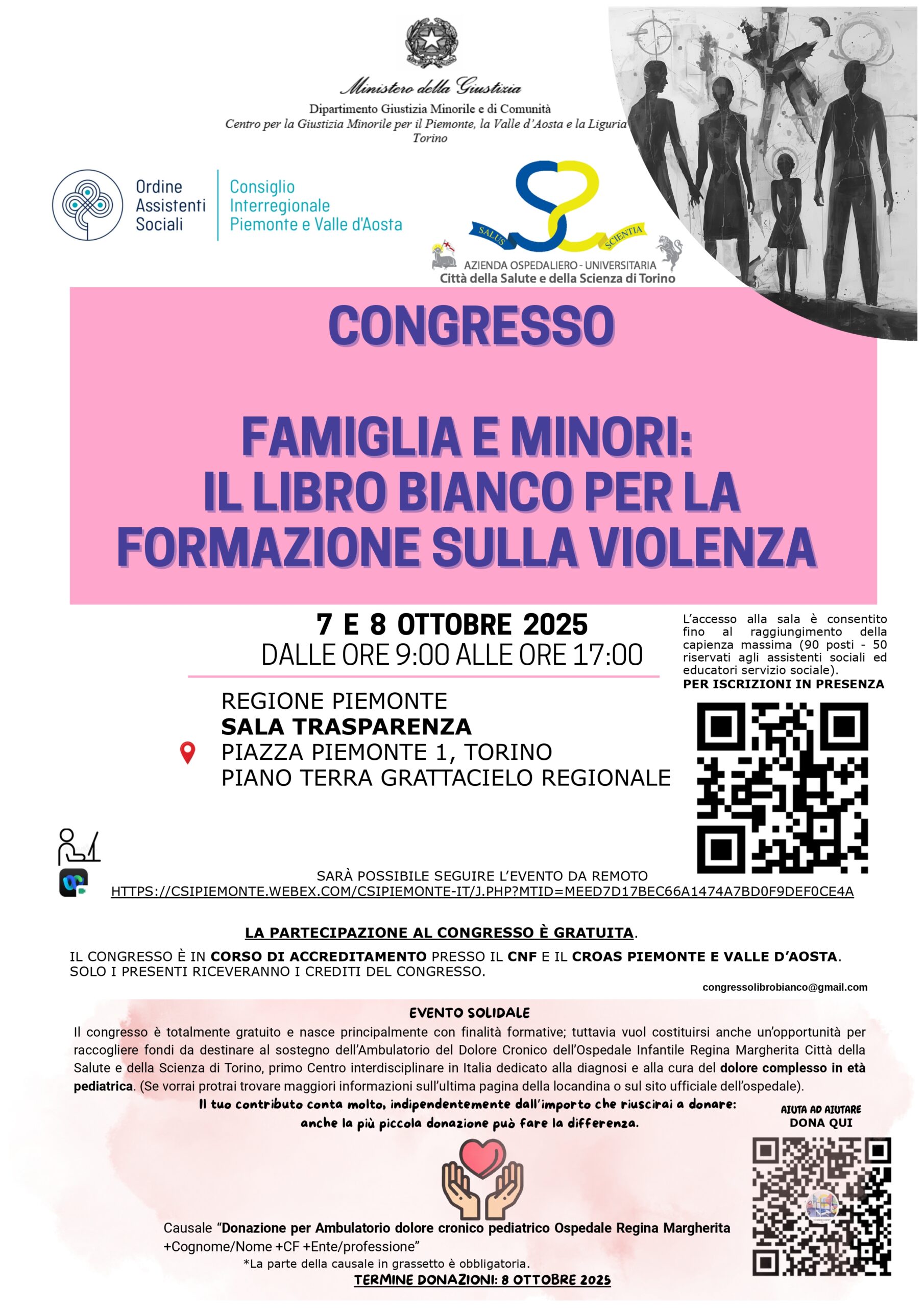 con la presente Vi segnaliamo il Congresso che si terrà il 7 e l’8 ottobre 2025 dal titolo “FAMIGLIA E MINORI: IL LIBRO BIANCO PER LA FORMAZIONE SULLA VIOLENZA” presso la sede della Regione Piemonte, Sala Trasparenza , sita in Piazza Piemonte 1 a Torino.