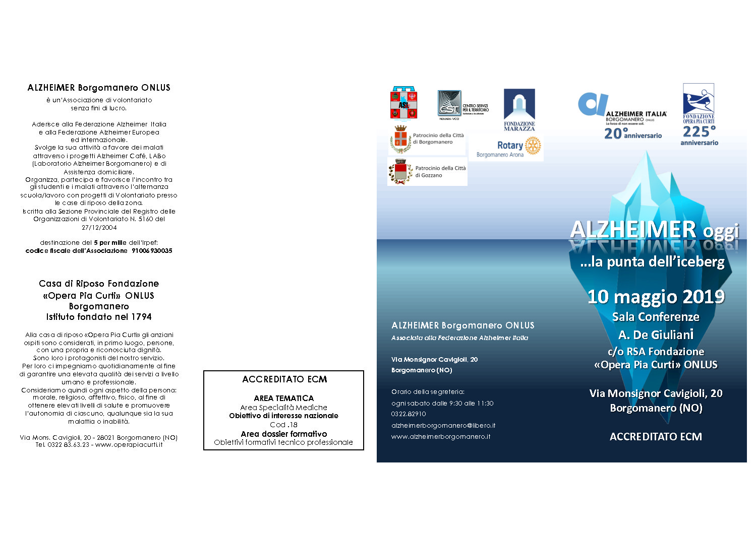 ALZHEIMER oggi …la punta dell’iceberg – 10 maggio 2019 – Borgomanero (NO) – Sala Conferenze A. De Giuliani c/o RSA Fondazione «Opera Pia Curti» ONLUS