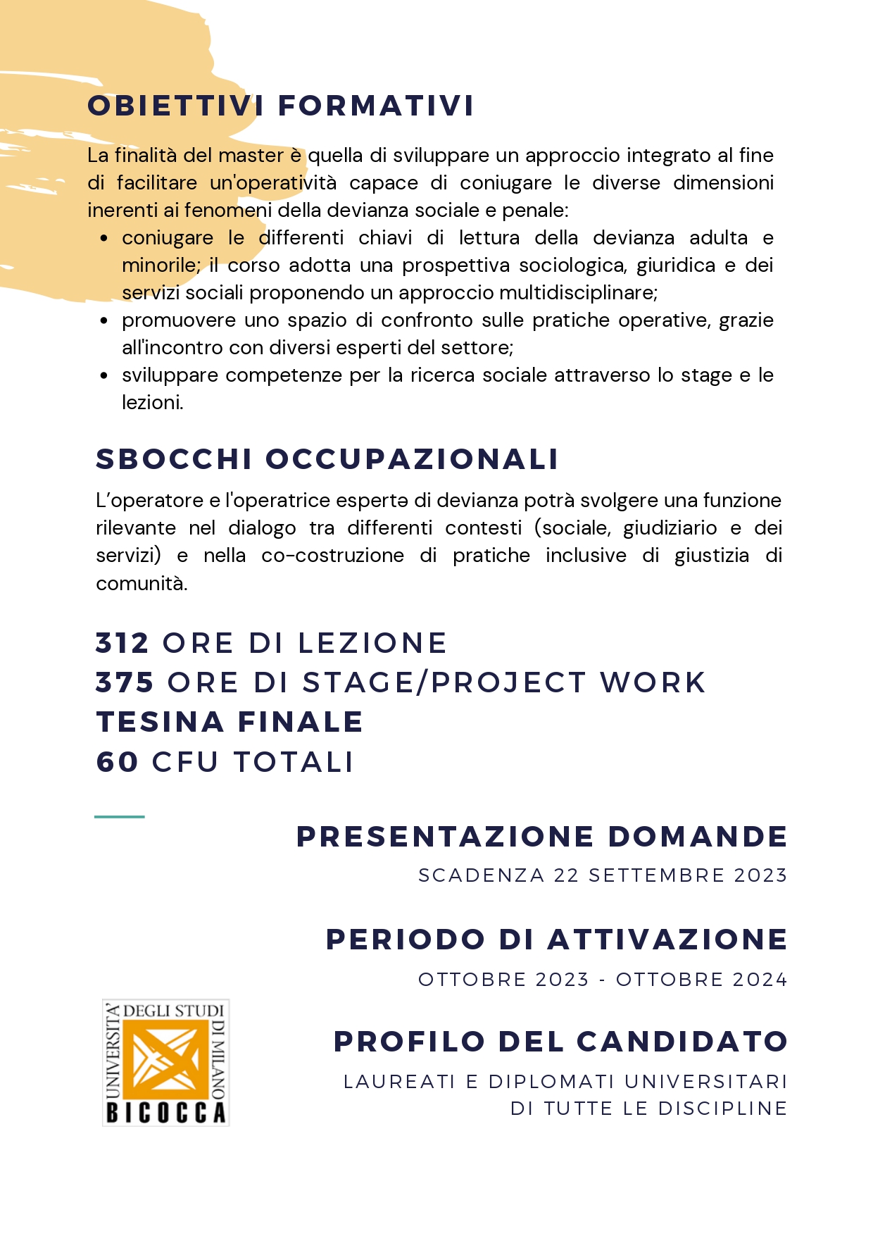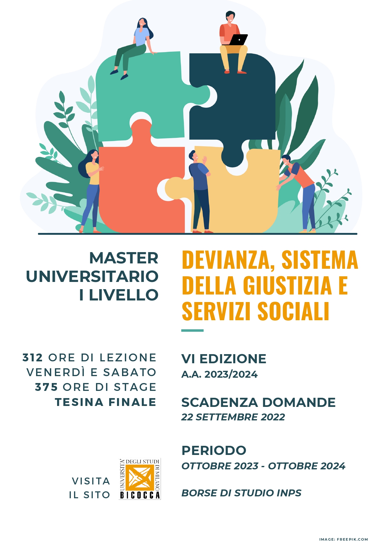 Sono aperte le iscrizioni al Master universitario di I livello A.A. 2023/2024 “Devianza, sistema della giustizia e servizi sociali” organizzato dall’Università Bicocca di Milano.