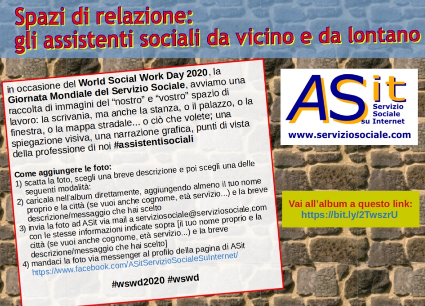 In occasione del World Social Work Day 2020 la Giornata Mondiale del Servizio Sociale, l’associazione ASit Servizio Sociale su Internet propone una raccolta di immagini del “nostro” e “vostro” spazio di lavoro: la scrivania, ma anche la stanza, o il palazzo, o la finestra, o la mappa stradale… o ciò che volete; una spiegazione visiva, una narrazione grafica di dove e come si è collocati nel mondo del lavoro e della professione.