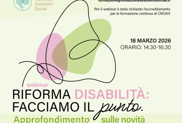 RICEVUTO E PUBBLICATO Webinar formativo: “Riforma disabilità: facciamo il punto. Approfondimento sulle novità normative e regolamentari” La Fondazione Nazionale degli Assistente Sociali organizza un webinar formativo dal titolo “Riforma disabilità: facciamo il punto. Approfondimento sulle novità normative e regolamentari” dedicato ...