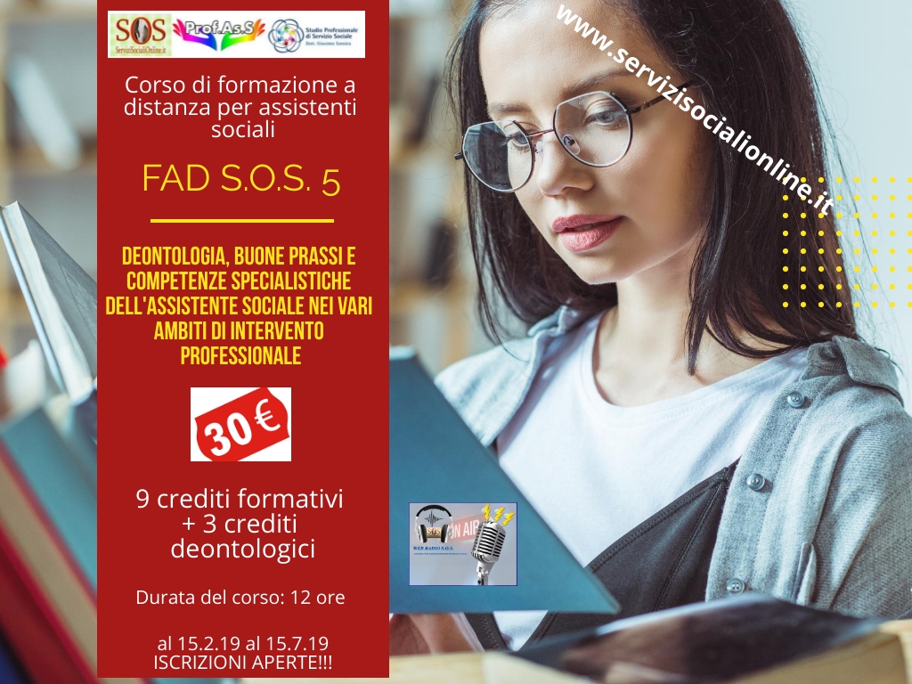 Corso FAD S.O.S. 5 “Deontologia, buone prassi e competenze specialistiche dell’assistente sociale nei vari ambiti di intervento professionale” – Richiesta pubblicazione – S.O.S. Servizi Sociali On Line