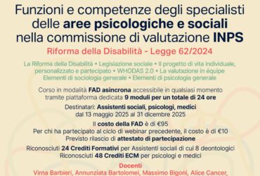 Promozione FAD “Funzioni e competenze degli specialisti delle aree psicologiche e sociali nella commissione di valutazione INPS – Riforma della disabilità 62/2024”