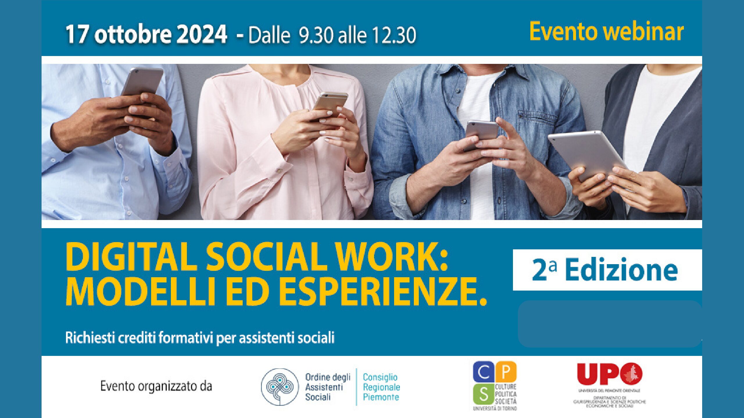 APERTE LE ISCRIZIONI 17 ottobre 2024 ore 9.30-12.30 WEBINAR formativo “Digital Social Work. Modelli ed Esperienze. 2^ Edizione” in collaborazione con UniTo ed UPO.
