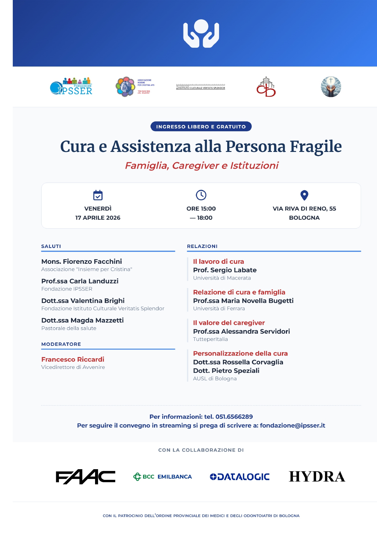 la Fondazione IPSSER organizza il convegno Cura e assistenza alla persona fragile. Famiglia, caregiver e istituzioni che si svolgerà il 17 aprile 2026 a Bologna.