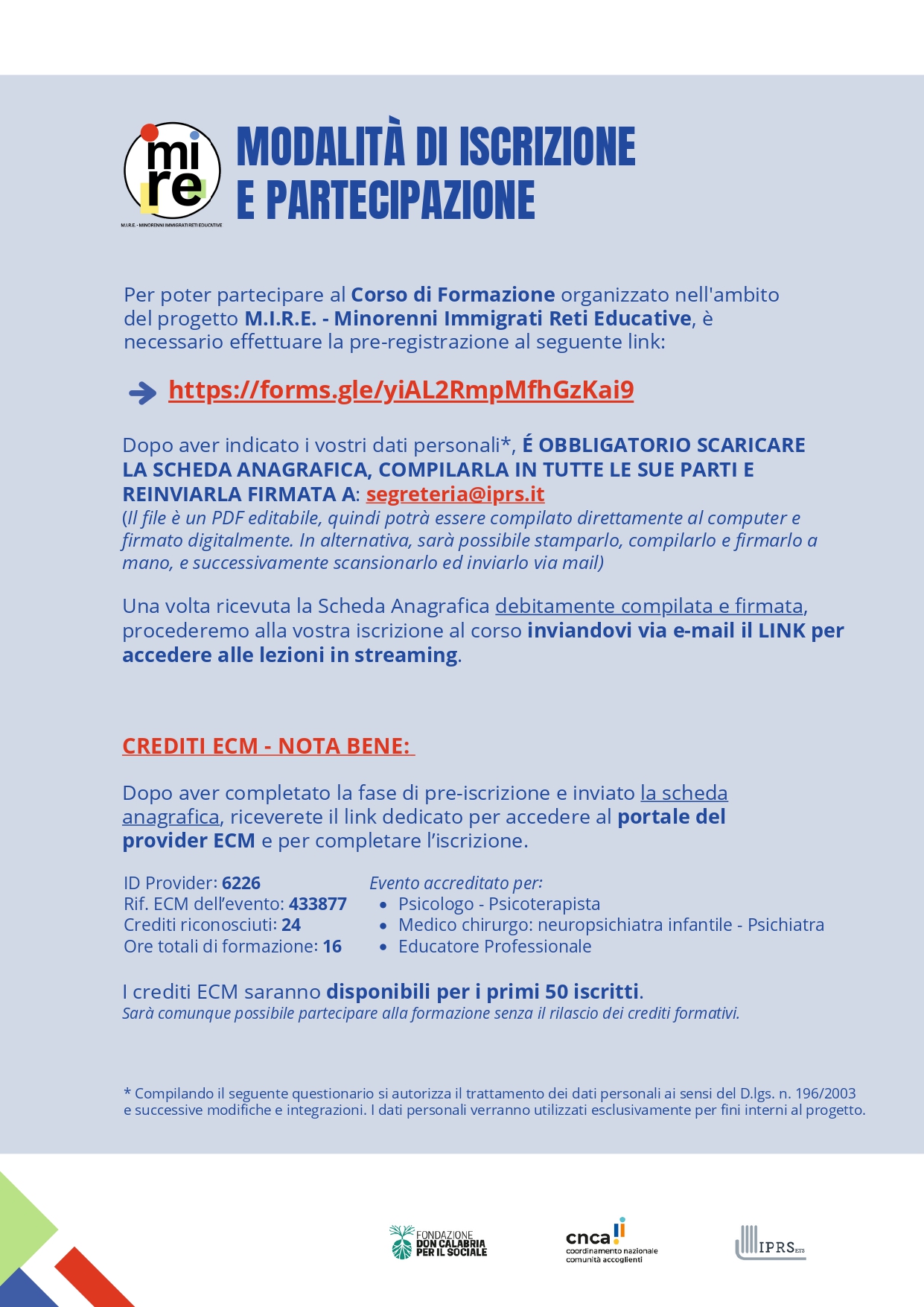 Una volta ricevuta la Scheda Anagrafica debitamente compilata e firmata, l’IPRS procederà alla vostra iscrizione al corso inviandovi per e-mail il LINK per accedere alla lezioni in streaming.