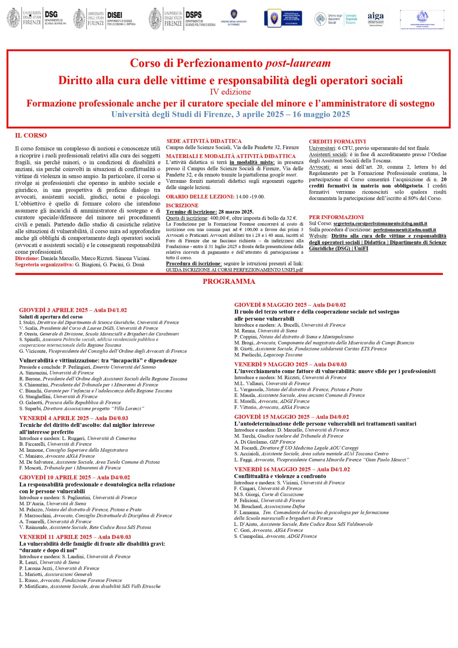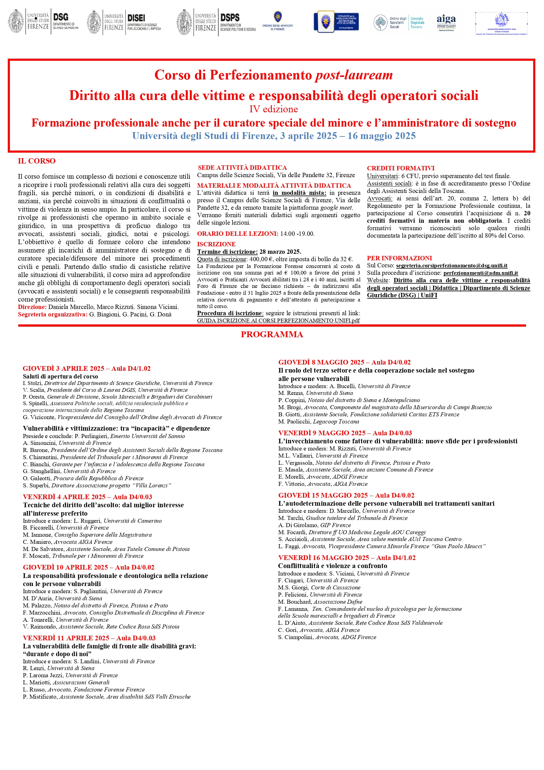 con la presente Vi condividiamo la locandina del Corso di Perfezionamento dal titolo “Diritto alla cura delle vittime e responsabilità degli operatori sociali” che si terrà a Firenze dal 3 aprile 2025 al 16 maggio 2025.