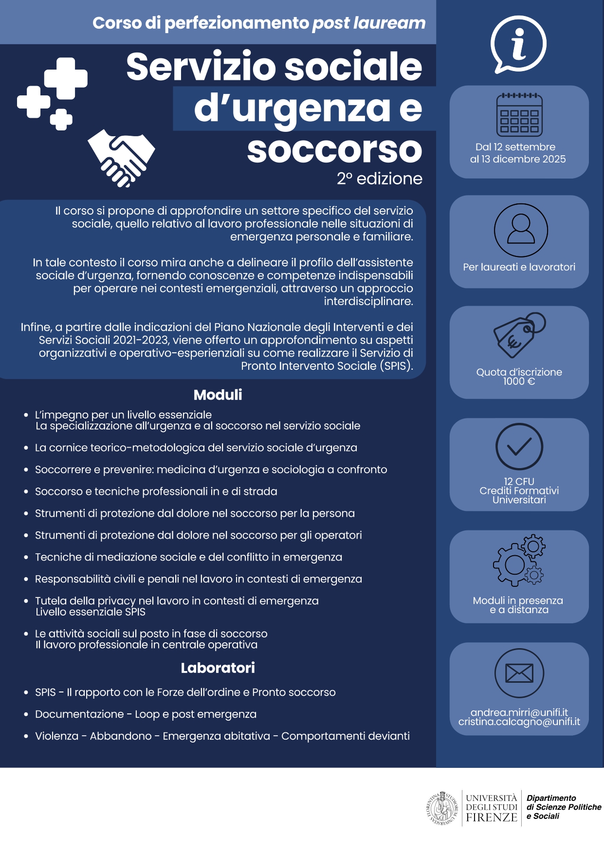 Corso di perfezionamento Post Lauream – “Servizio sociale d’urgenza e soccorso” 27 Agosto 2025 Gentili colleghi e colleghe, Vi condividiamo la locandina del Corso di perfezionamento organizzato dall’Università degli Studi di Firenze. Per ogni informazione è necessario rivolgersi agli indirizzi riportati nella locandina. segreteria 27 Agosto 2025 Articolo Precedente 14 ottobre 2025 Workshop “BRUTTI COME IL DEBITO” – Crediti formativi e deontologici riconosciuti- Articolo Successivo [PROROGA] Azienda Speciale Retesalute – Avviso pubblico per assunzione a tempo ind. e pieno di n. 1 assistente sociale e formazione graduatoria per assunzioni di assistenti sociali. Scadenza 25/09/2025 ore 12.