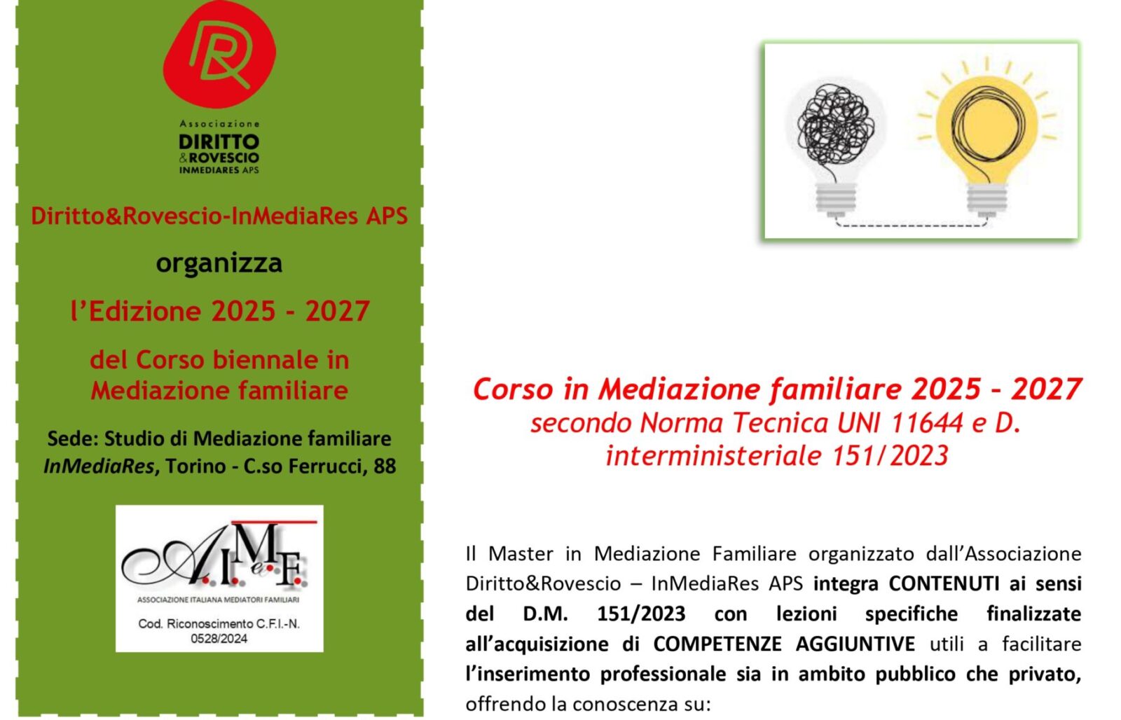 L’Associazione Diritto&Rovescio – InMediaRes APS organizza l’edizione 2025-2027 del Corso biennale in Mediazione Familiare, secondo Norma Tecnica UNI 11644 e D.M. 151/2023.