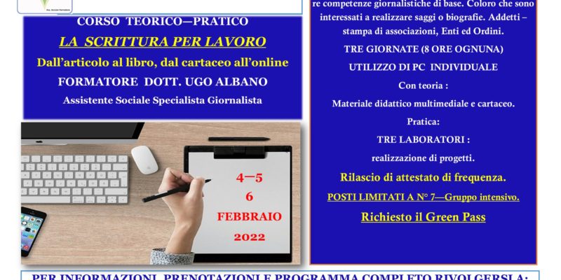 Corso teorico-pratico a pagamento “La scrittura per lavoro. Dall’articolo al libro, dal cartaceo all’online” 4-5-6 febbraio 2022 – Anzio (RM)