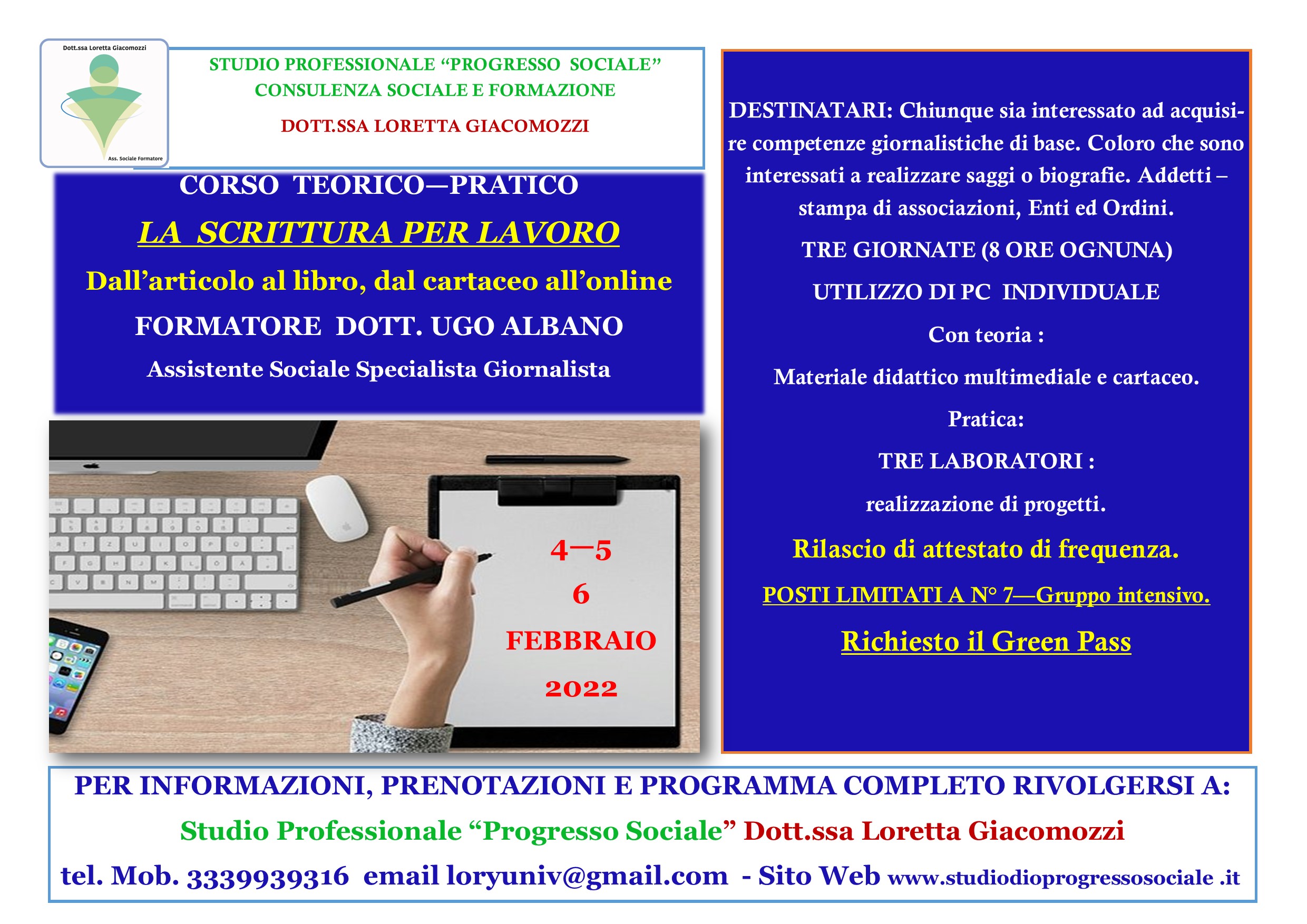 Lo studio professionale “Progresso Sociale” organizza il corso teorico-pratico a pagamento “La scrittura per lavoro. Dall’articolo al libro, dal cartaceo all’online”