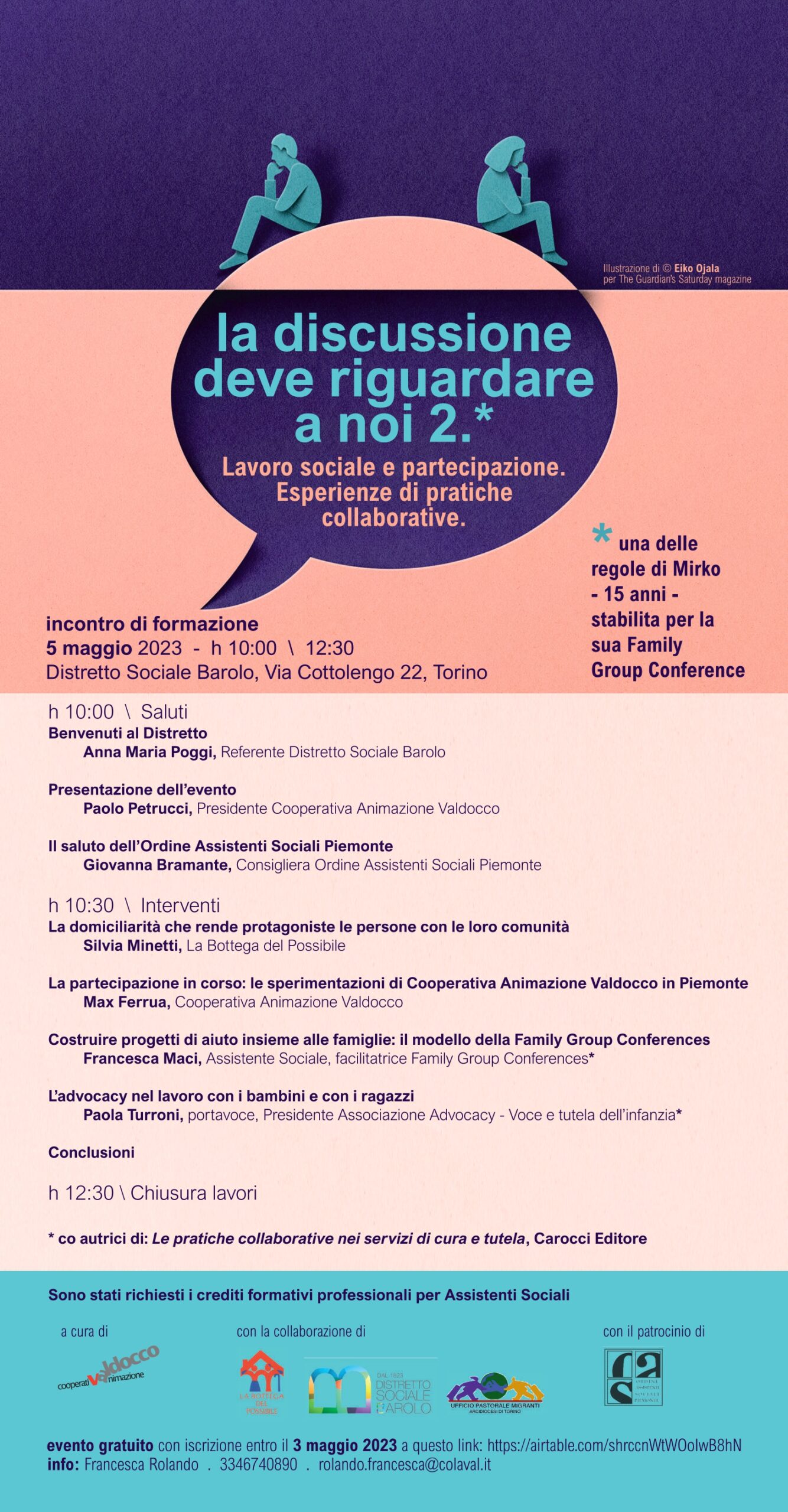 Si segnala l’evento formativo e divulgativo “La discussione deve riguardare a noi 2. Lavoro sociale e partecipazione. Esperienze di pratiche collaborative.” che avrà luogo tra le 10.00 e le 12.30 del 5 maggio 2023 presso la sede dell’Ufficio Pastorale Migranti all’interno del Distretto Sociale Barolo, ed è organizzato da Cooperativa Animazione Valdocco, in collaborazione con l’Associazione Bottega del Possibile e con il patrocinio dell’Ordine Assistenti Sociali Regione Piemonte. ISCRIZIONI ENTRO IL 3 MAGGIO