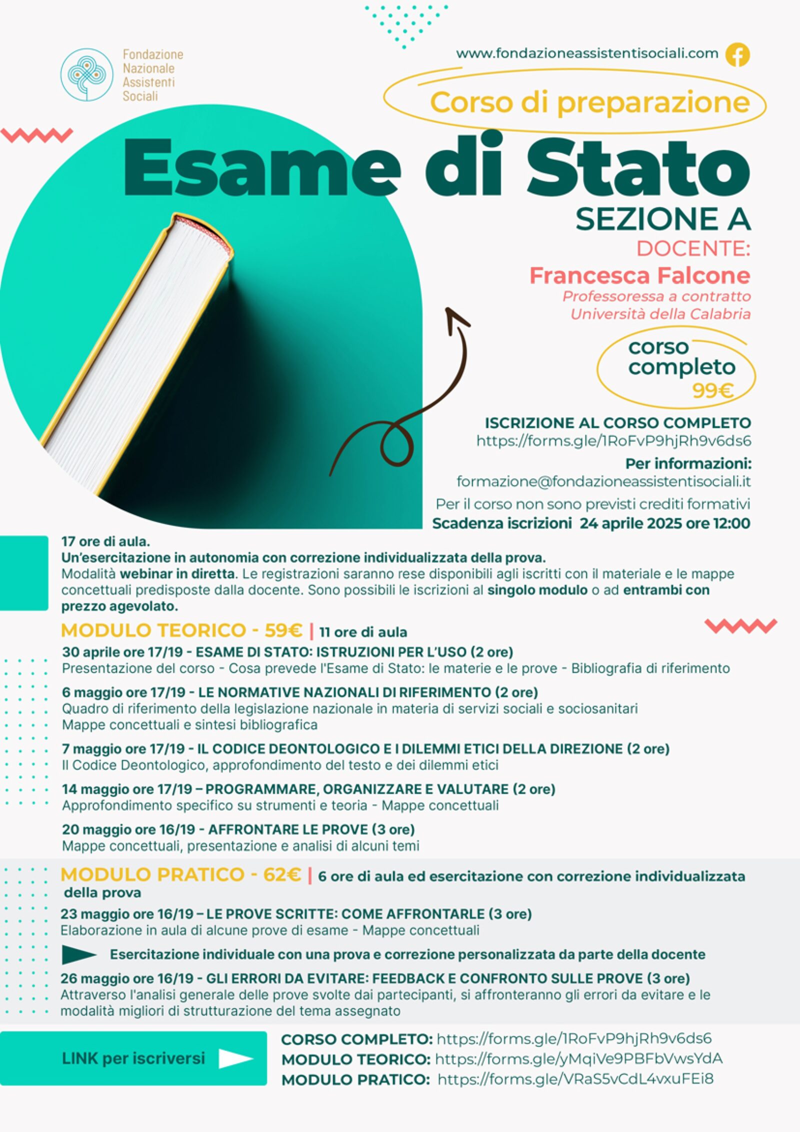 - Il corso per la sezione A, condotto dalla professoressa Francesca Falcone, partirà il 30 aprile e il termine per l’iscrizione è il 24 aprile ore 12:00.