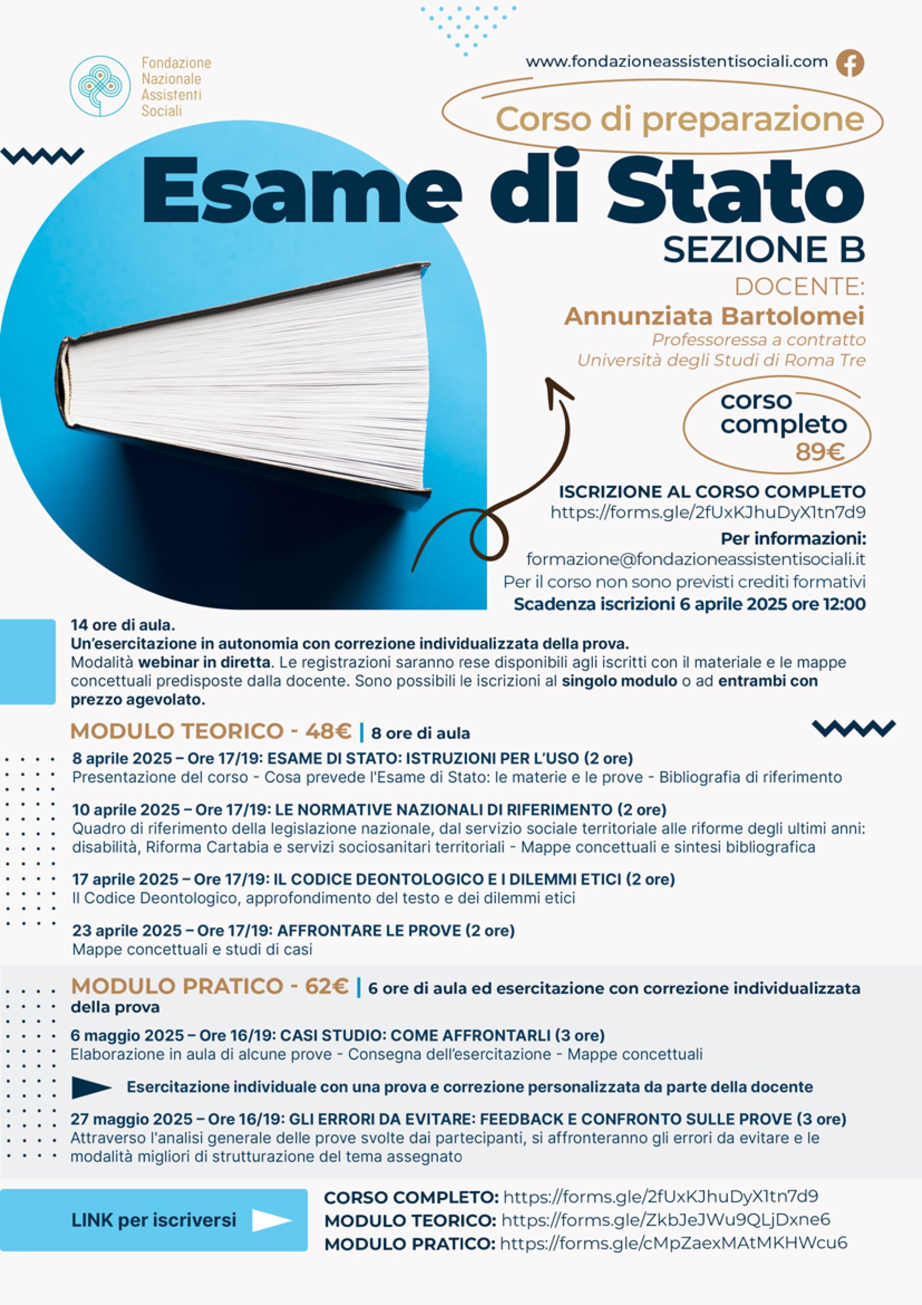 Le ore di aula sono 17: 11 per il modulo teorico e 6 per quello pratico. - Il corso per la sezione B, condotto dalla professoressa Annunziata Bartolomei Torna, partirà l’8 aprile e il termine per l’iscrizione è il 6 aprile ore 12:00.