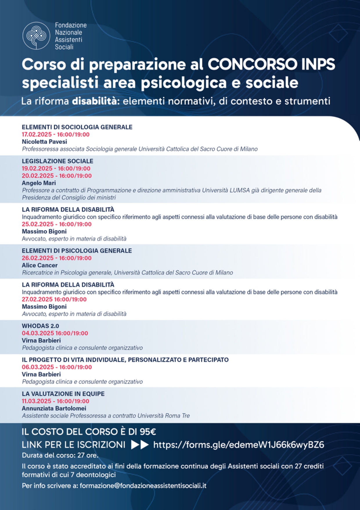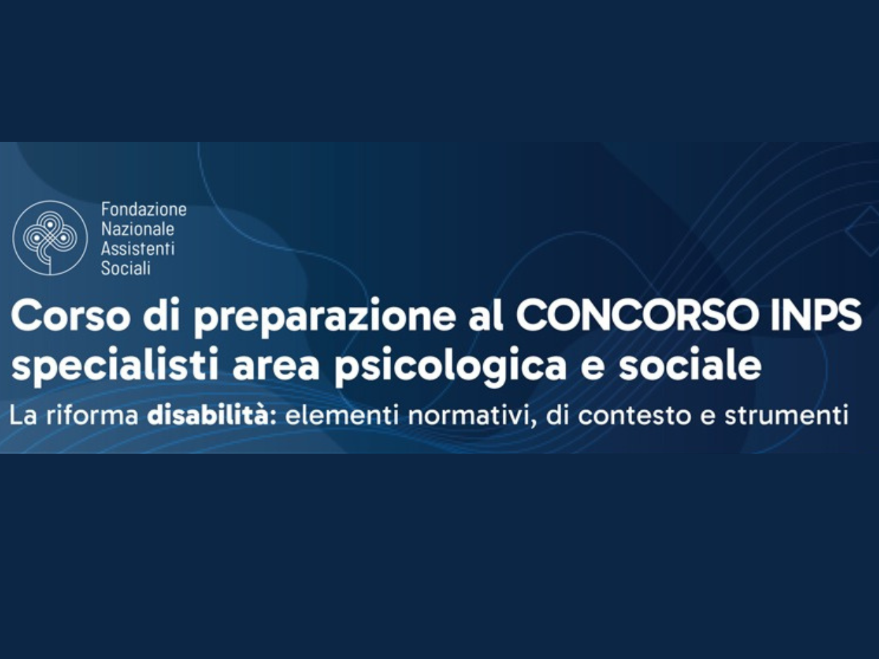 FNAS organizza un corso di preparazione al Concorso INPS specialisti area pricologica e sociale 6 Febbraio 2025 segreteria 6 Febbraio 2025 Articolo Precedente AZIENDA SOCIALE DESTRA SECCHIA – Selezione pubblica per formazione di graduatoria per assunzione, a tempo pieno e determinato di assistenti sociali, per servizi e progetti dell’Azienda. Scadenza domande 28/02/2025 ore 13.00 Articolo Successivo Giornata Nazionale contro il Bullismo e il Cyberbullismo: «Fondamentale la prevenzione»