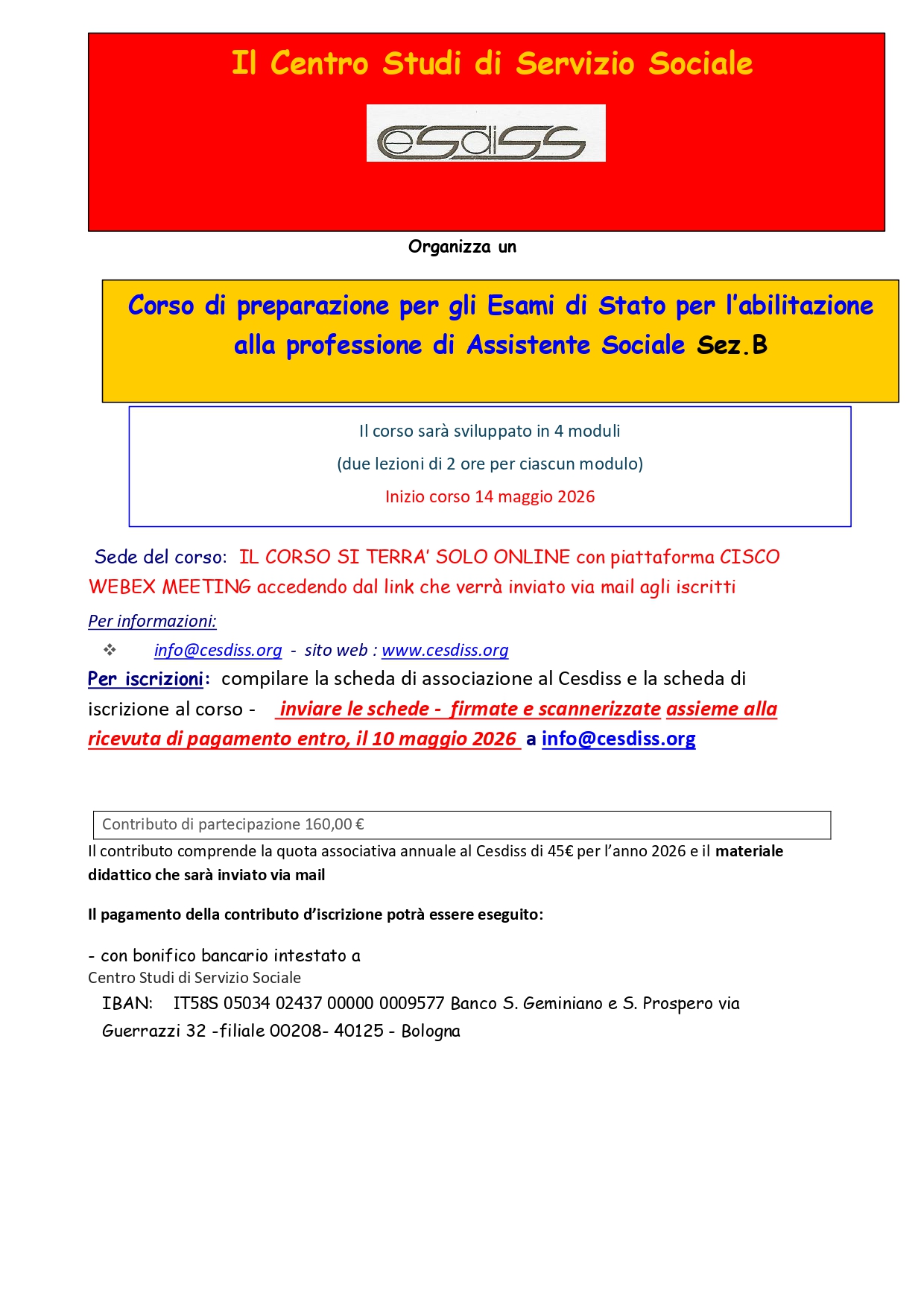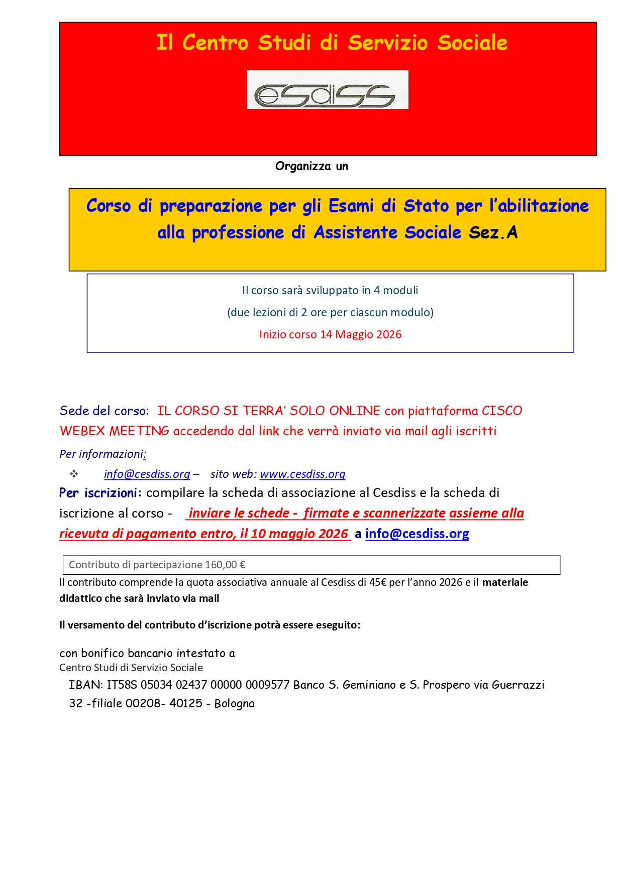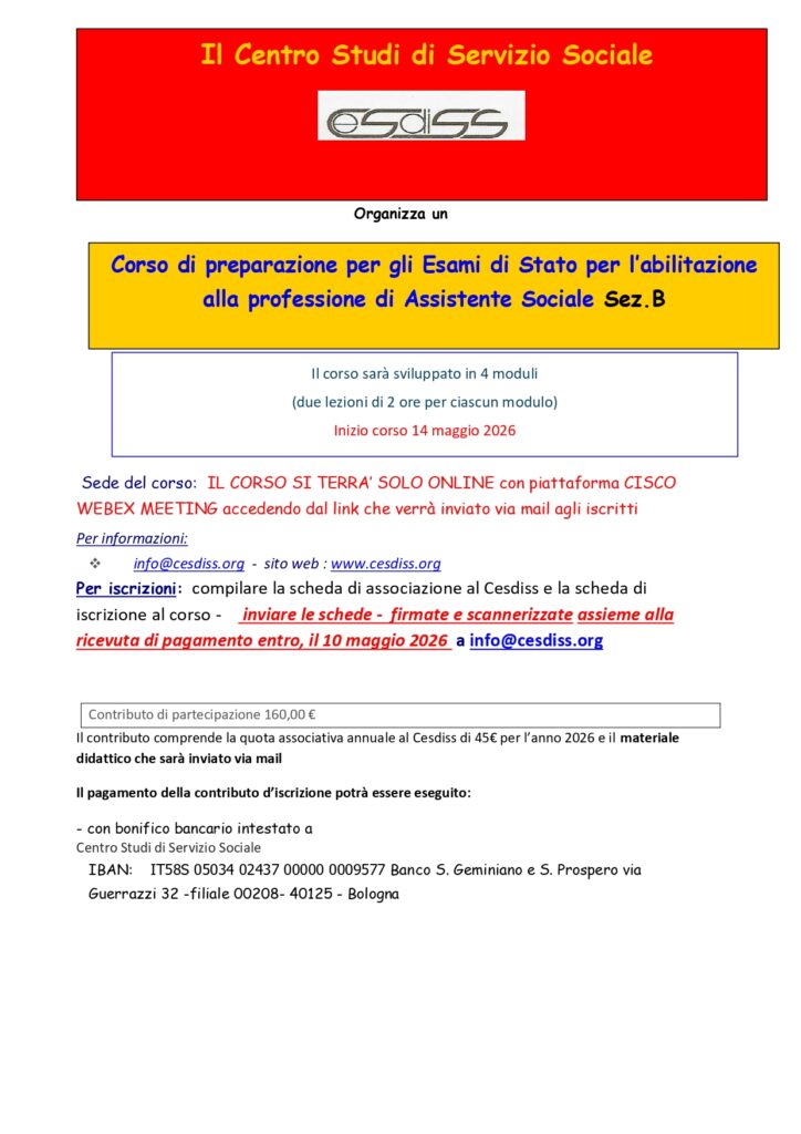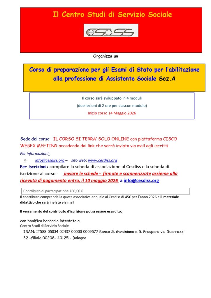 Il Centro Studi di servizio Sociale (Cesdiss) associazione accreditata per la formazione presso il CNOAS, per la sessione di giugno 2026 organizza un corso di preparazione all’esame di Stato per Assistenti Sociali per la sez.A e per la sez.B, il cui inizio sarà il 14 maggio p.v.