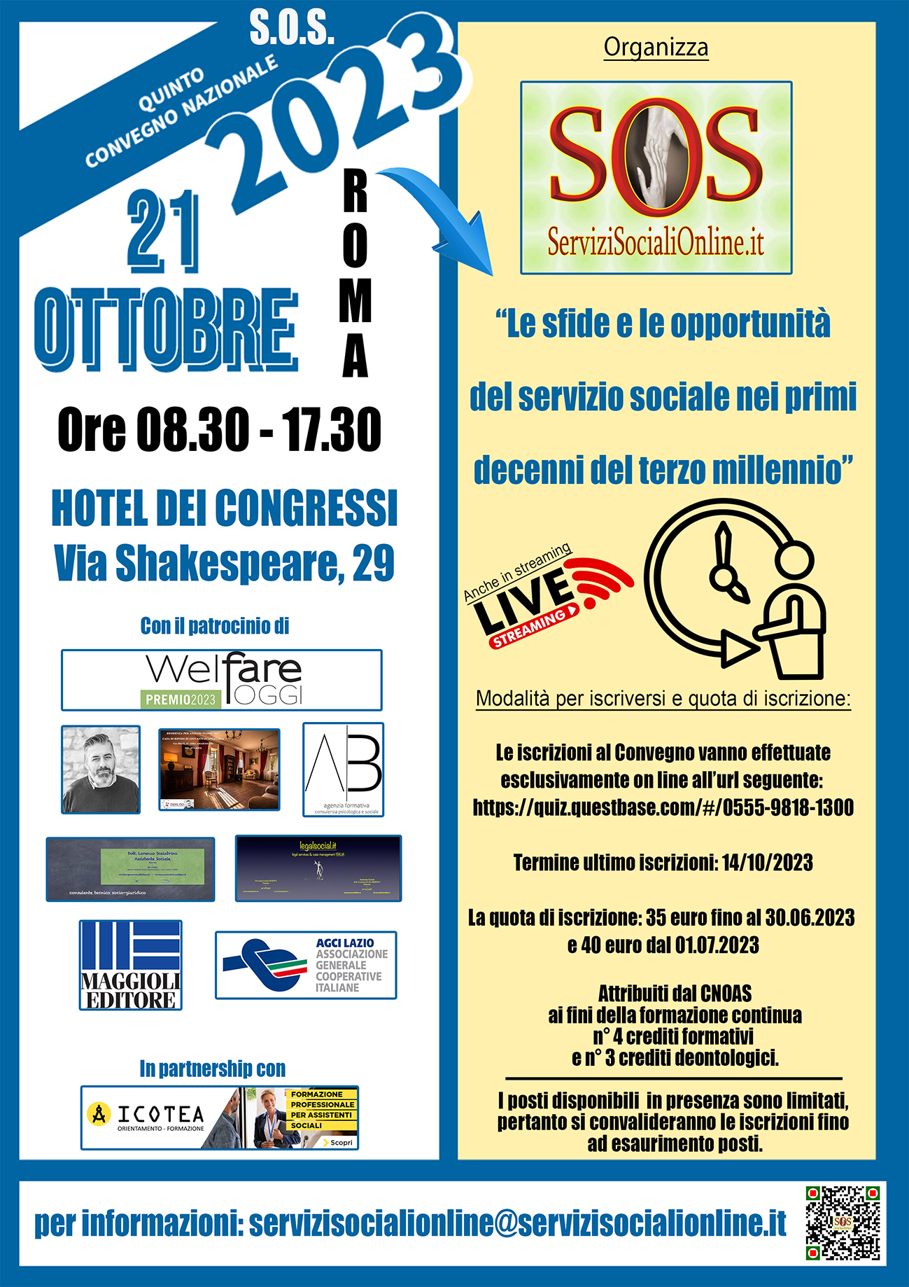 L’agenzia formativa S.O.S. Servizi Sociali On Line ha organizzato e programmato il V° Convegno Nazionale titolato “Le sfide e le opportunità del servizio sociale nei primi decenni del terzo millennio”.