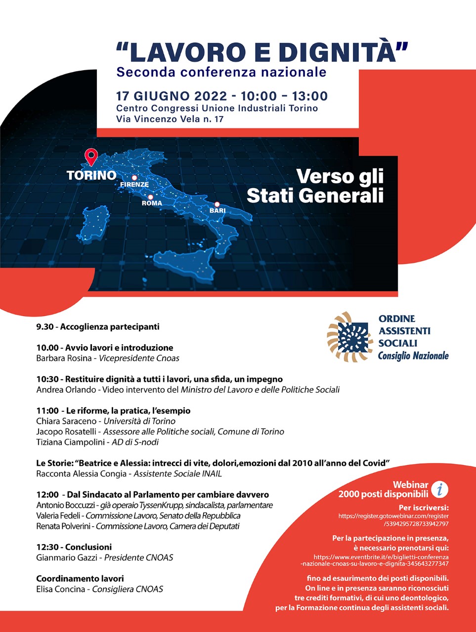 Con 400 presenze e 2000 assistenti sociali collegati on line, con il ministro del Lavoro e delle Politiche sociali, con studiosi, parlamentari, amministratori pubblici e persone impegnate nel territorio, metteremo al centro quelle situazioni nelle quali il lavoro non rende liberi e un salario non dà dignità.