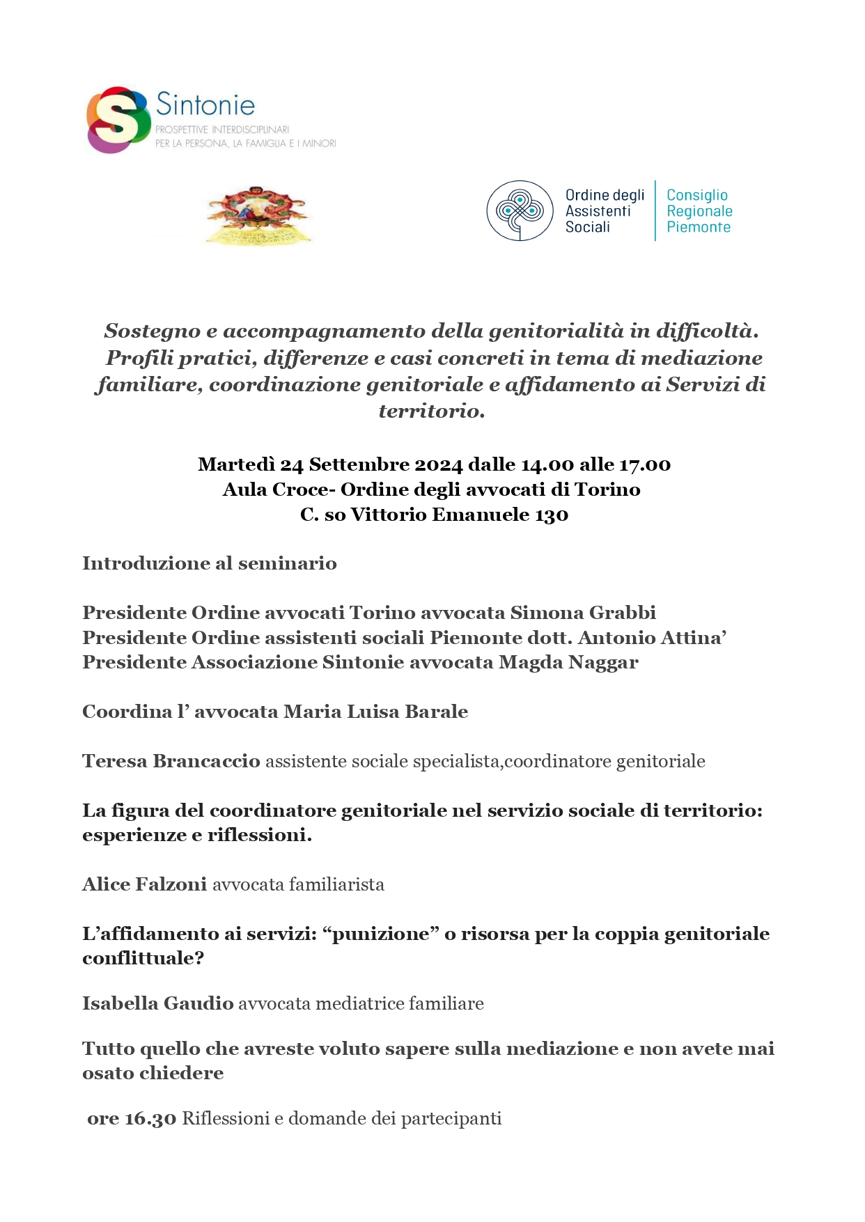 con la presente vi invitiamo al seminario che si terrà Martedì 24 Settembre 2024 dalle 14.00 alle 17.00 presso l’Aula Croce- Ordine degli avvocati di Torino in Corso Vittorio Emanuele 130.
