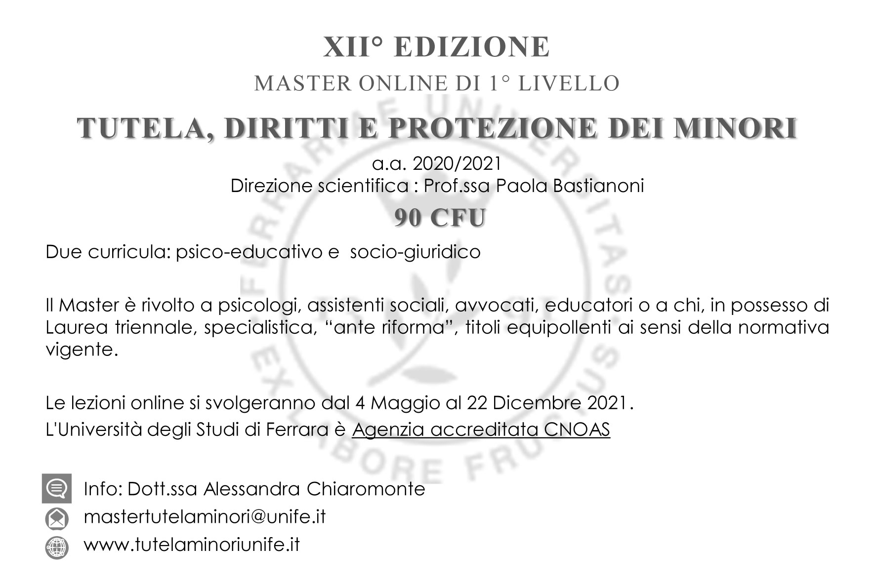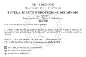 Parte il 4 Maggio 2021 la XII edizione del Master Tutela, diritti e protezione dei minori, a. a. 2020 – 2021, diretto dalla Prof.ssa Paola Bastianoni!