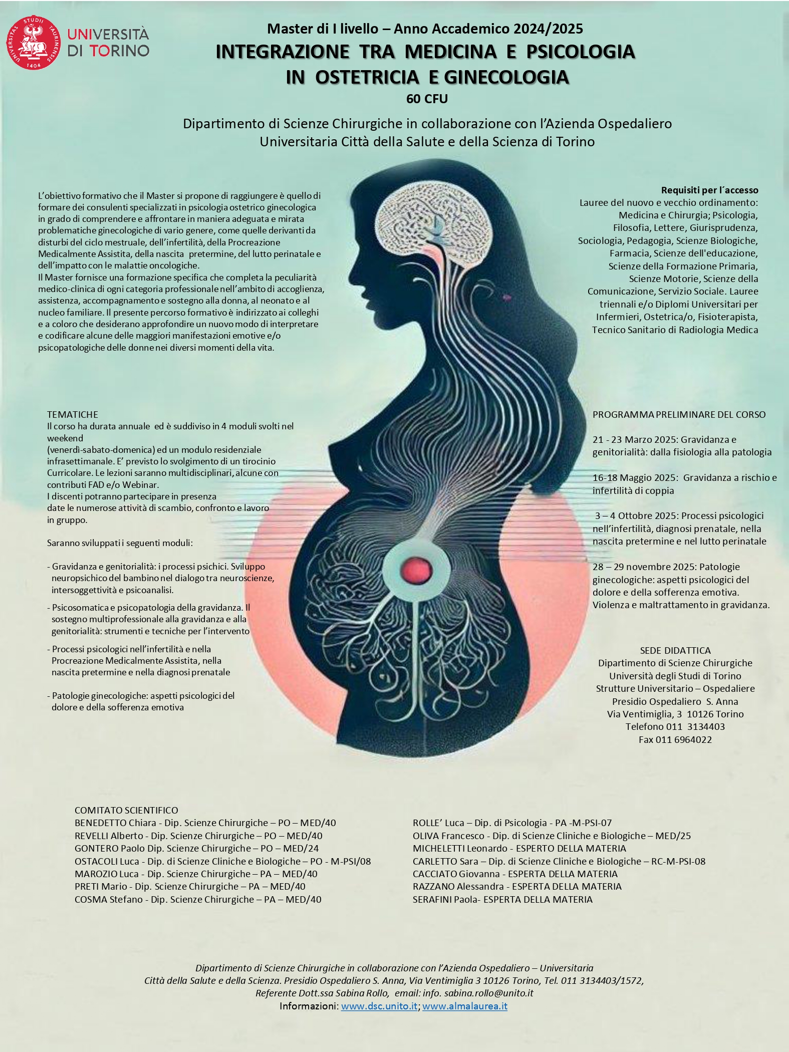 In allegato, la Locandina del Master universitario di 1° livello in “Integrazione tra medicina e psicologia in ostetricia e ginecologia”, organizzato dal Dipartimento di Scienze Chirurgiche in collaborazione con l’Azienda Ospedaliero Universitaria Città della Salute e della Scienza di Torino.