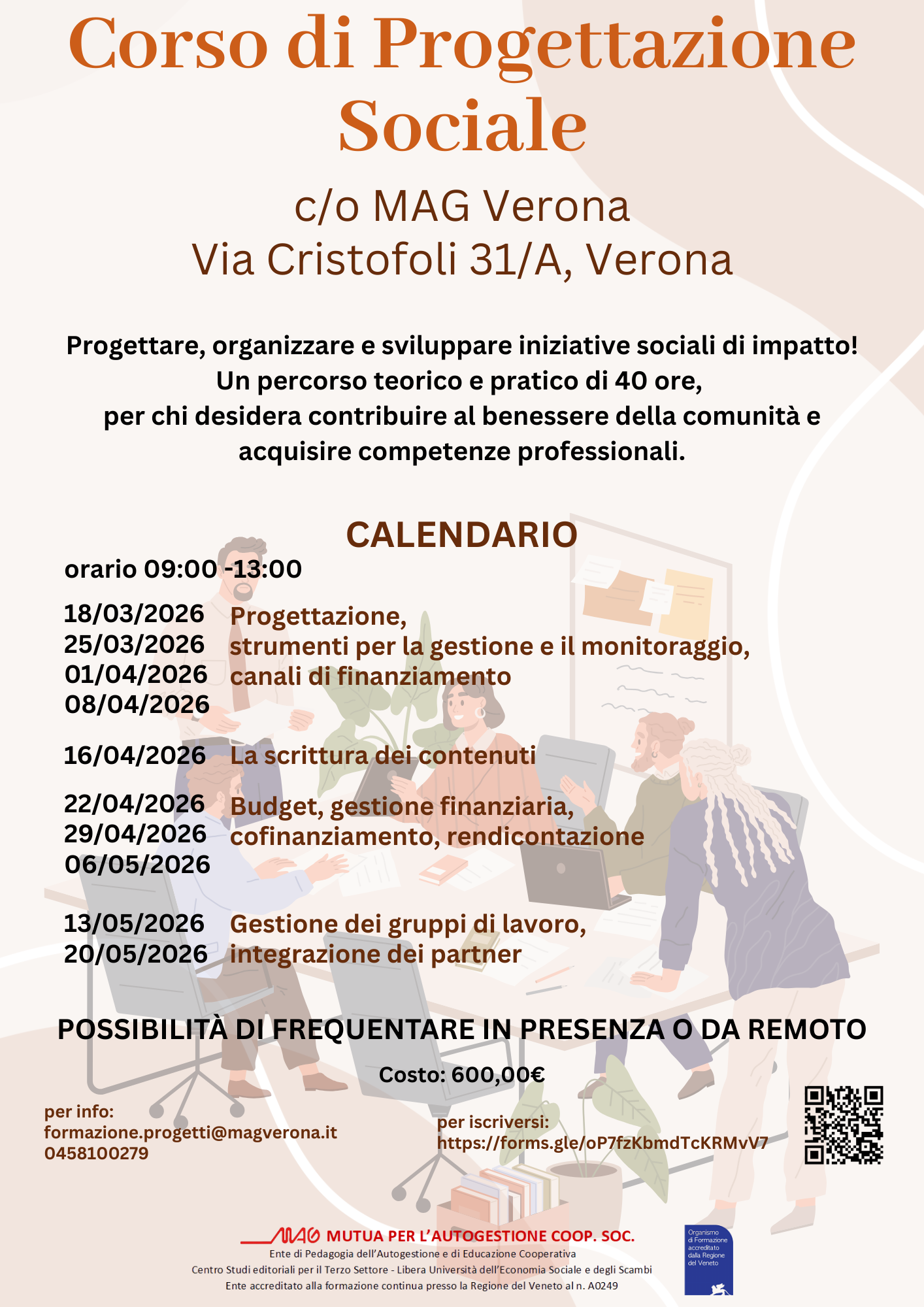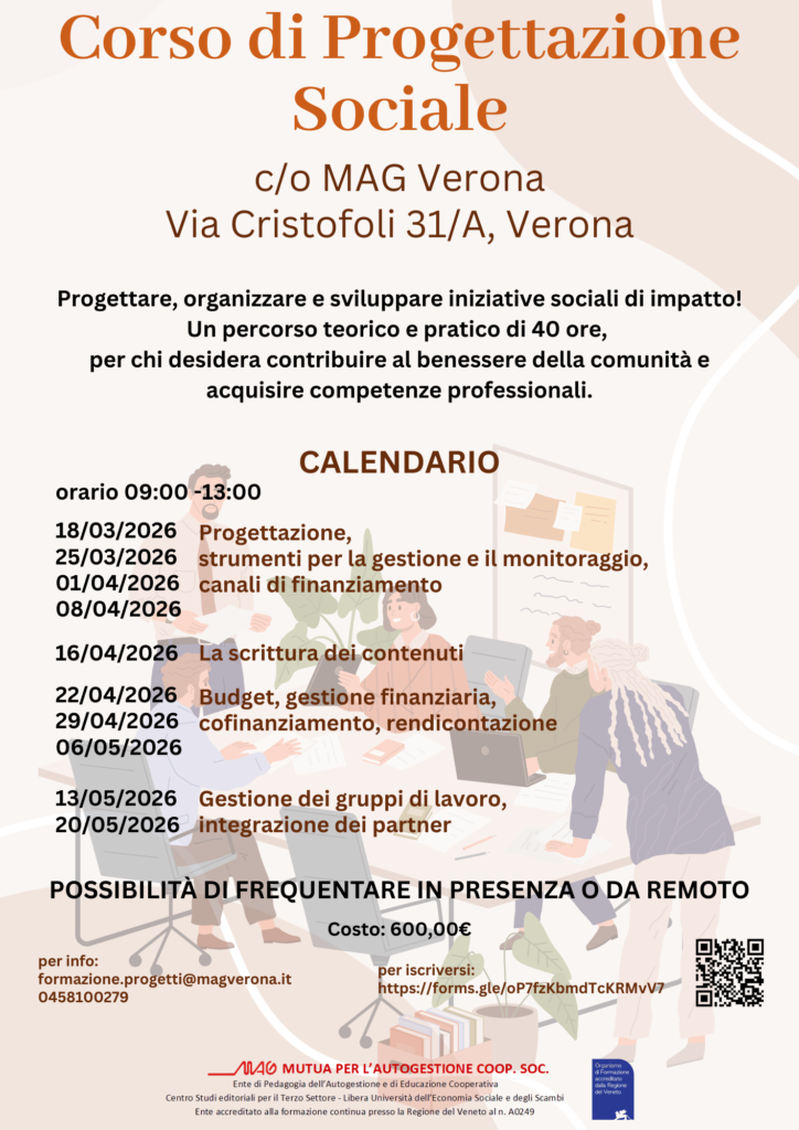 MAG Verona ente di formazione accreditato organizza un Corso in Progettazione Sociale. Un percorso teorico e pratico di 40 ore, per chi desidera contribuire al benessere della comunità e acquisire competenze professionali.