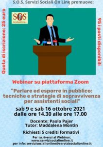 S.O.S. on line organizza il webinar è “Parlare ed esporre in pubblico: tecniche e strategie di sopravvivenza per assistenti sociali”. Sono stati richiesti 5 crediti formativi al CNOAS.