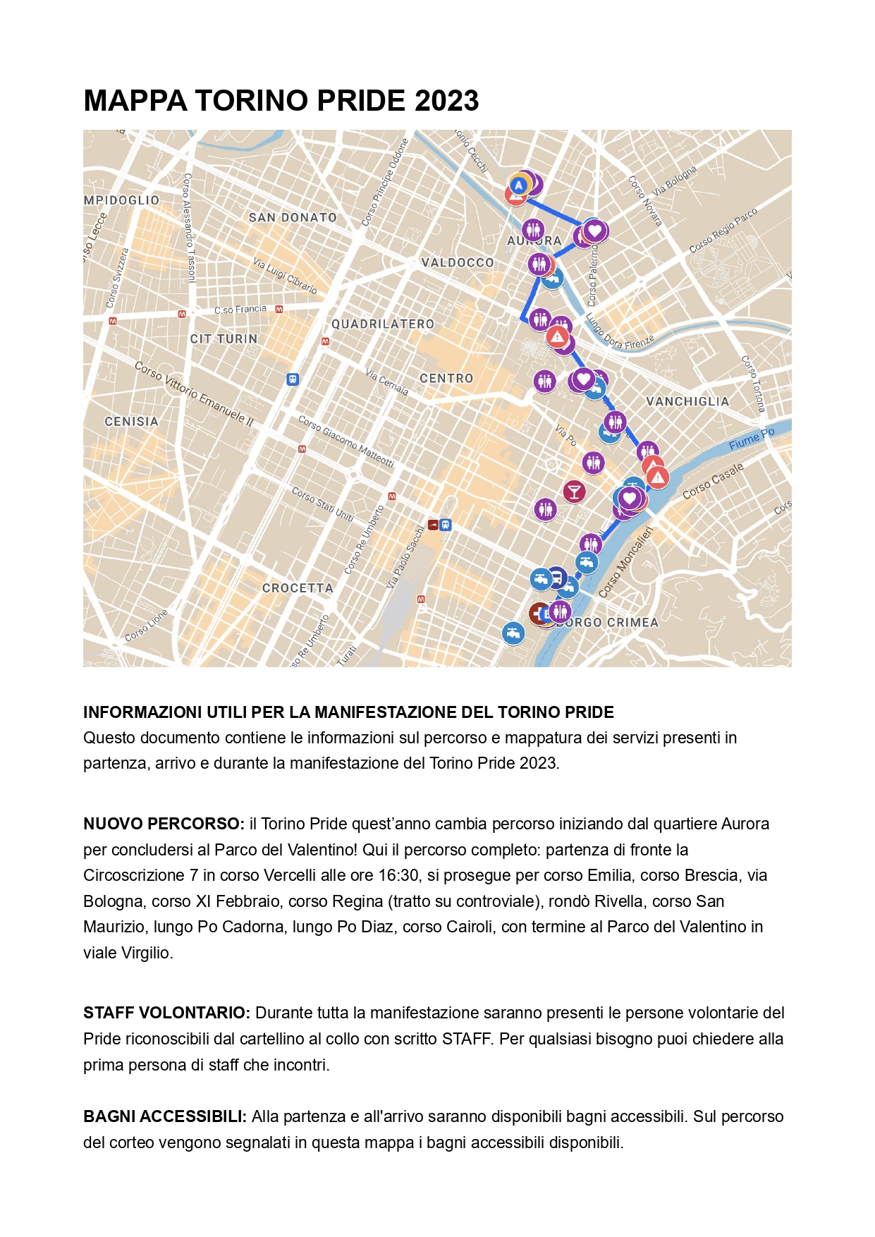 Sabato 17 giugno a Torino si terrà il Torino Pride 2023. L’appuntamento con il nuovo percorso, che attraverserà la Torino arcobaleno, vedrà come punto di partenza corso Vercelli 15, nel quartiere Aurora, alle 16,30. Il Pride proseguirà poi per corso Emilia, corso Brescia, via Bologna, corso XI Febbraio, corso Regina (tratto su controviale), rondò Rivella, corso San Maurizio, lungo Po Cadorna, lungo Po Diaz, corso Cairoli. L’arrivo sarà al Parco del Valentino, in viale Virgilio, dove si potrà assistere agli interventi delle associazioni facenti parte del Coordinamento di Torino Pride e si potrà far sentire, attraverso la partecipazione, il proprio sostegno alla comunità LGBTQIA+.