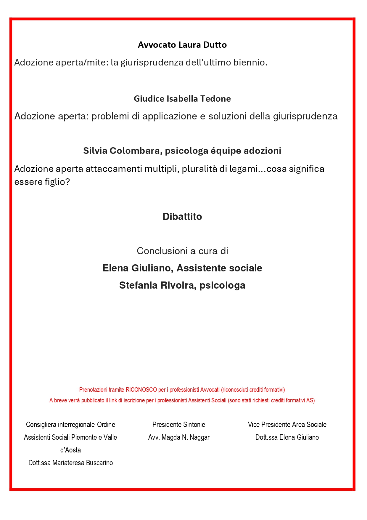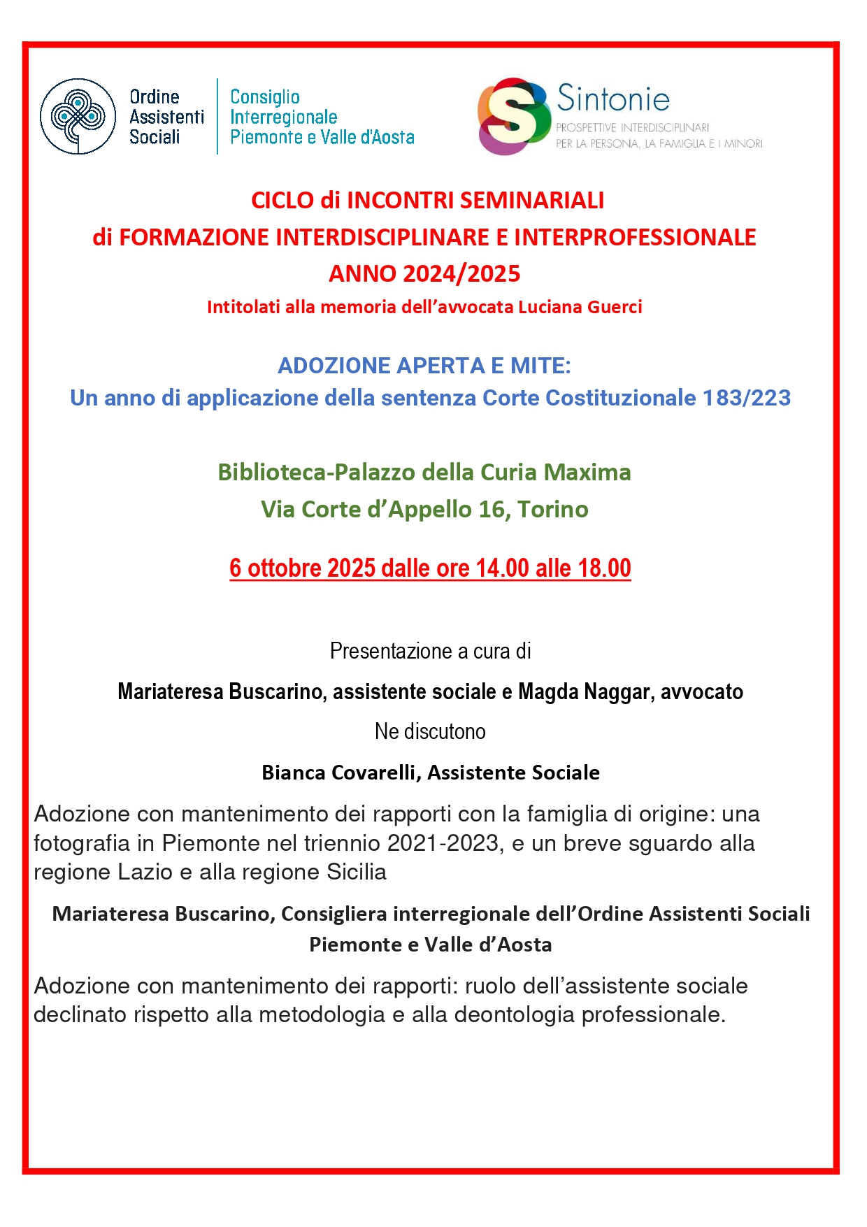 vi invitiamo a partecipare all’evento organizzato dalll’OAS Piemonte e Valle d’Aosta in collaborazione con Sintone, dal titolo “Adozione aperta e mite: un anno di applicazione della sentenza Corte Costituzionale 183/223″, un incontro formativo sul tema dell’adozione in prospettiva interdiscplinare e interprofessionale.