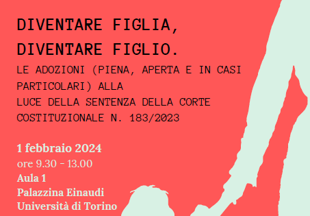 Il 1° febbraio 2024 dalle ore 9.30 alle ore 13.00 presso l’Aula 1 della Palazzina Einaudi dell’Università di Torino si terrà il Convegno “Diventare figlia, diventare figlio. Le adozioni (piena, aperta e in casi particolari) alla luce della sentenza della Corte Costituzionale n. 183/2023”.