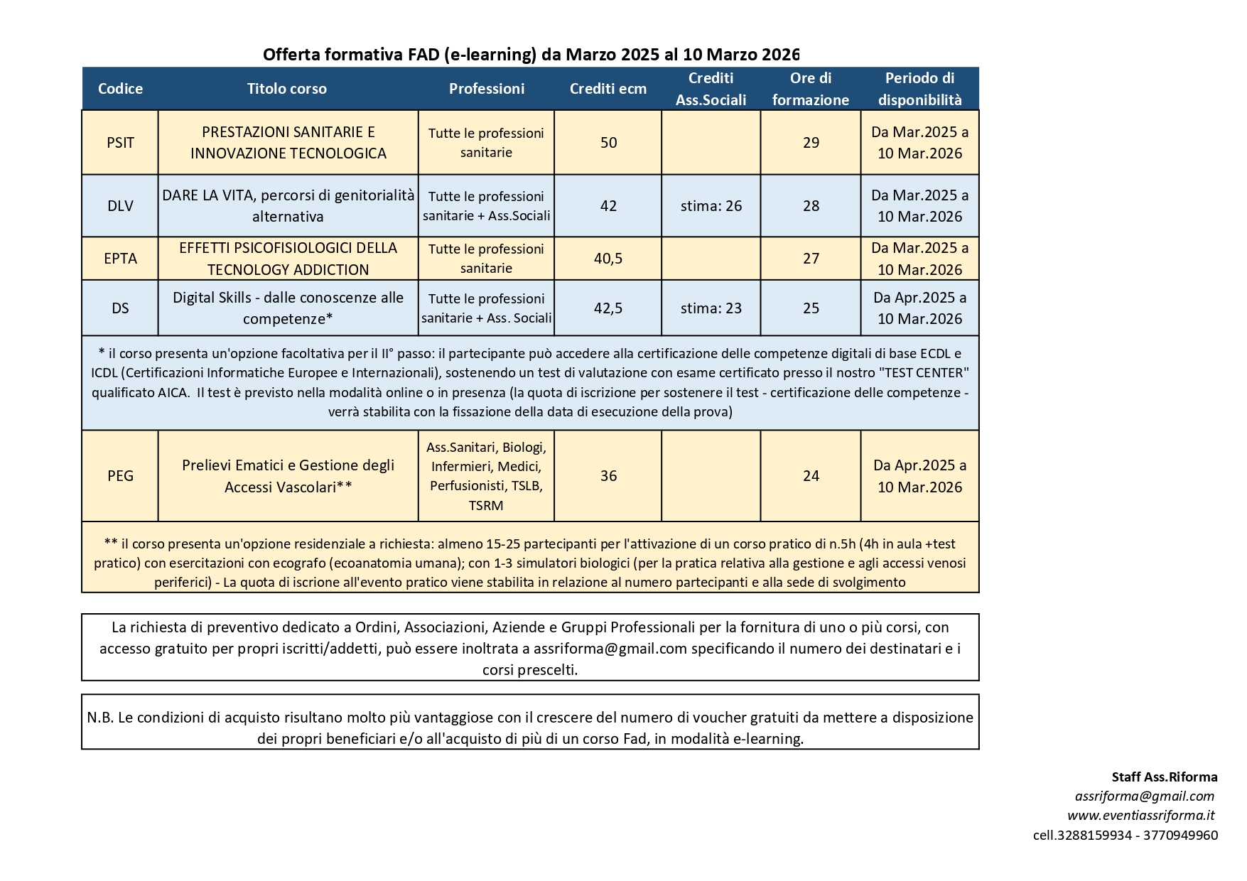 Si diffonde Offerta formativa Fad E-learning 2025 Ass. Riforma programma da Marzo 2025 a Marzo 2026