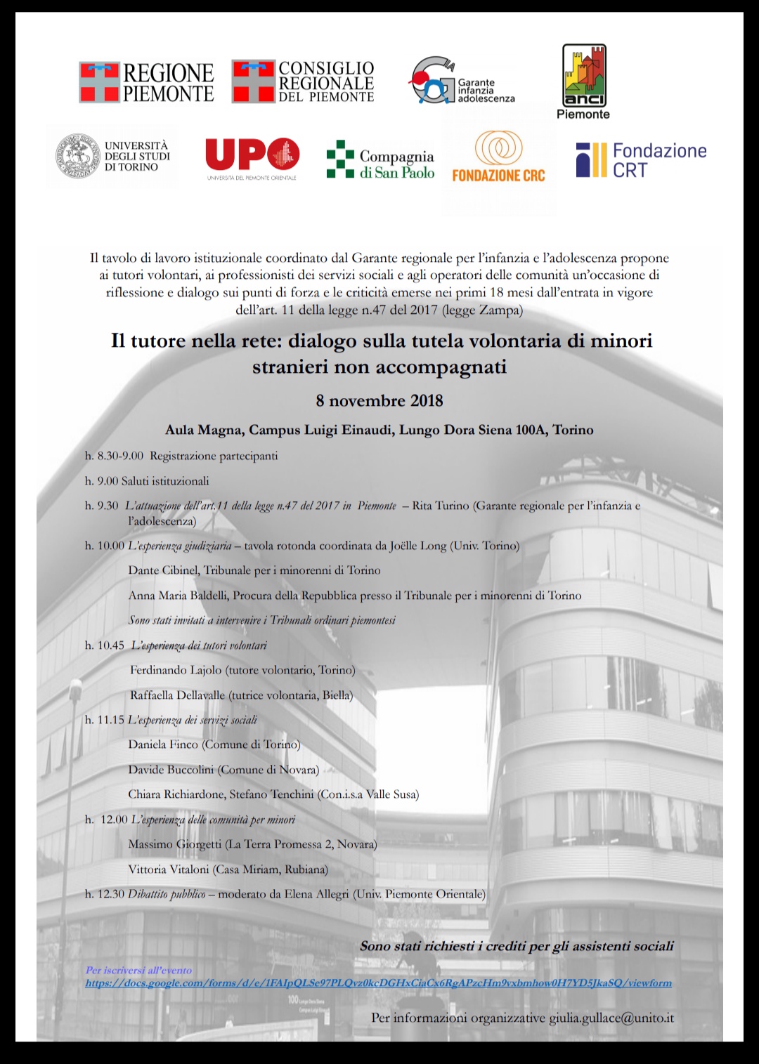Torino – 8 novembre 2018 – Il tutore nella rete: dialogo sulla tutela volontaria di minori stranieri non accompagnati 24 Ottobre 2018 Riceviamo e pubblichiamo. Il tutore nella rete: dialogo sulla tutela volontaria di minori stranieri non accompagnati 8 novembre 2018 segreteria 24 Ottobre 2018