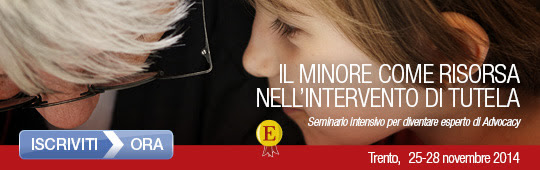Date e sede del corso: 25, 26, 27 e 28 novembre 2014 – Trento (Edizioni Centro Studi Erickson) Seminario intensivo per diventare esperto di Advocacy L’operatore di advocacy ricopre la funzione di portavoce dei bambini o dei ragazzi con cui lavora, per garantire che gli operatori che sono tenuti a decidere ascoltino le loro considerazioni e ne tengano conto. Questa figura professionale garantisce quindi ai minori uno spazio di ascolto indipendente e riservato in circostanze delicate, come ad esempio il collocamento fuori famiglia, in comunità educativa o in affido familiare. |