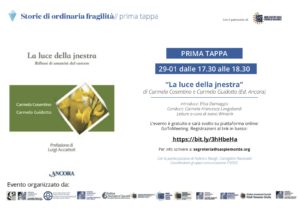 29-01-2021 dalle 17.30 alle 18.30 “La luce della jnestra” di Carmela Cosentino e Carmelo Guidotto (ed. Ancora). Coordinamento a cura dell’Ordine Assistenti Sociali del Trentino Alto Adige con la partecipazione di Elisa Damaggio e Ivano Winterle. Conduce l’intervista Francesca Longobardi del Croas Piemonte. Con la partecipazione del referente comunicazione Cnoas Federico Basigli.