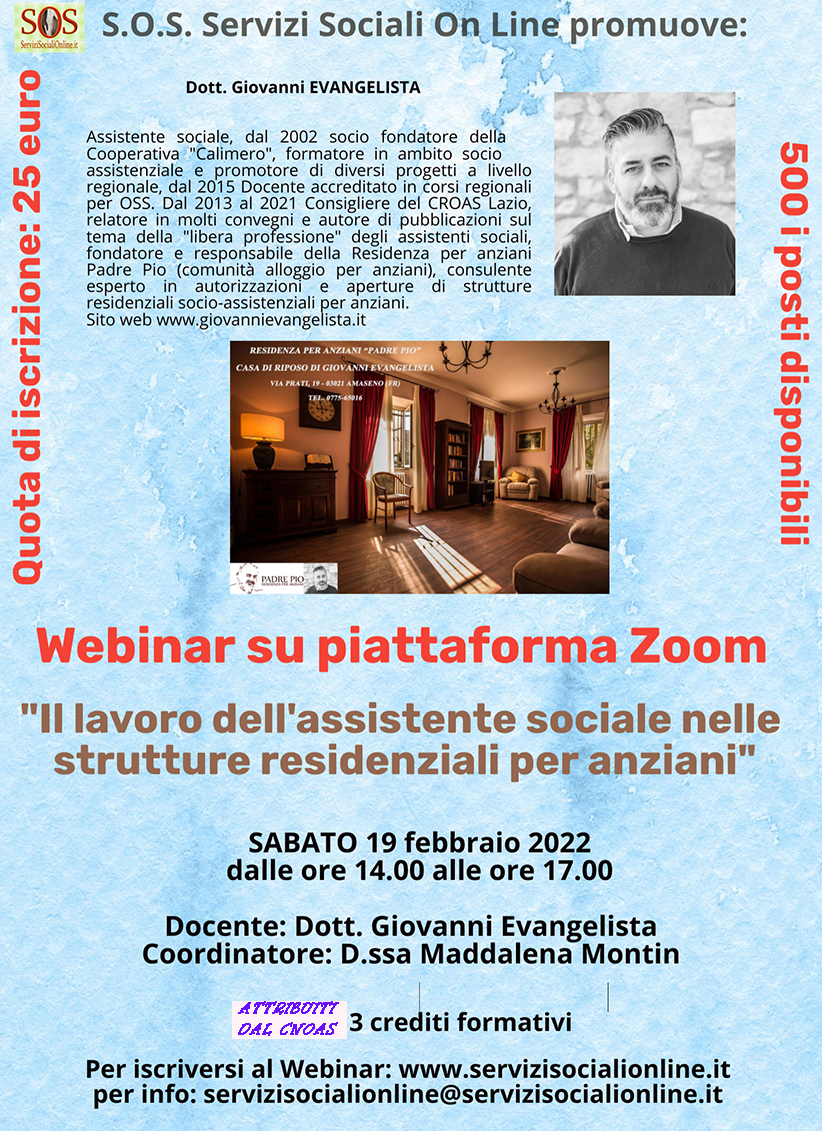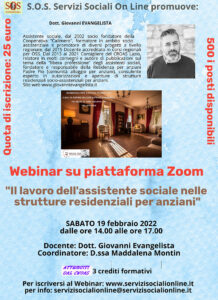 L’agenzia formativa S.O.S. servizi sociali on line, organizza il webinar a pagamento dal titolo “Il lavoro dell’assistente sociale nelle strutture residenziali per anziani” che si svolgerà il 19 febbraio 2022 dalle ore 14.00 alle ore 17.00.