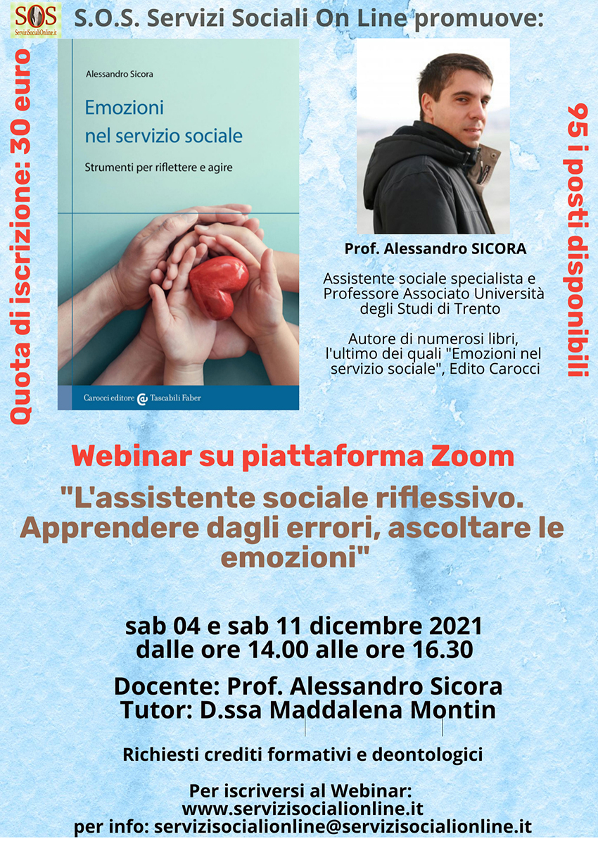L’agenzia formativa S.O.S. servizi sociali on line organizza il webinar a pagamento dal titolo “L’assistente sociale riflessivo. Apprendere dagli errori, ascoltare le emozioni”.