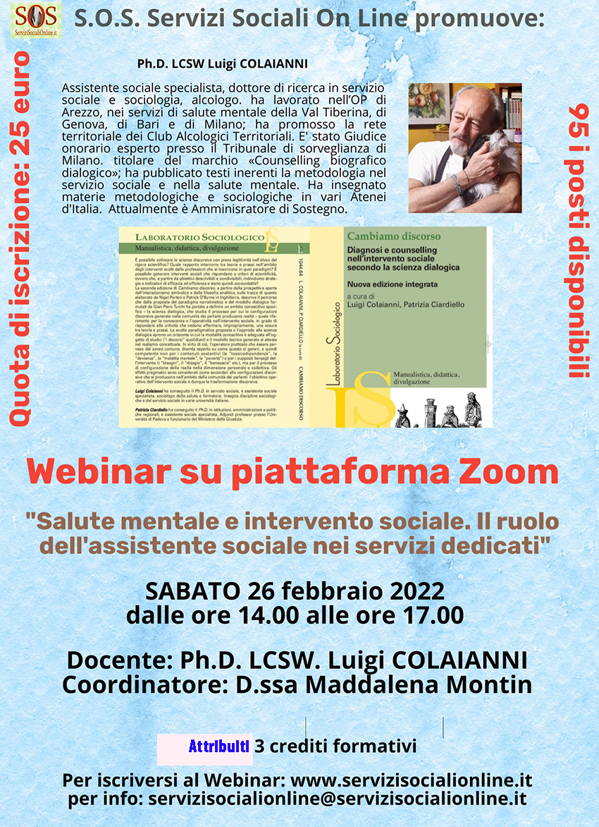 L’agenzia formativa S.O.S. servizi sociali on line organizza il webinar a pagamento dal titolo “Salute mentale e intervento sociale. Il ruolo dell’assistente sociale nei servizi dedicati.”